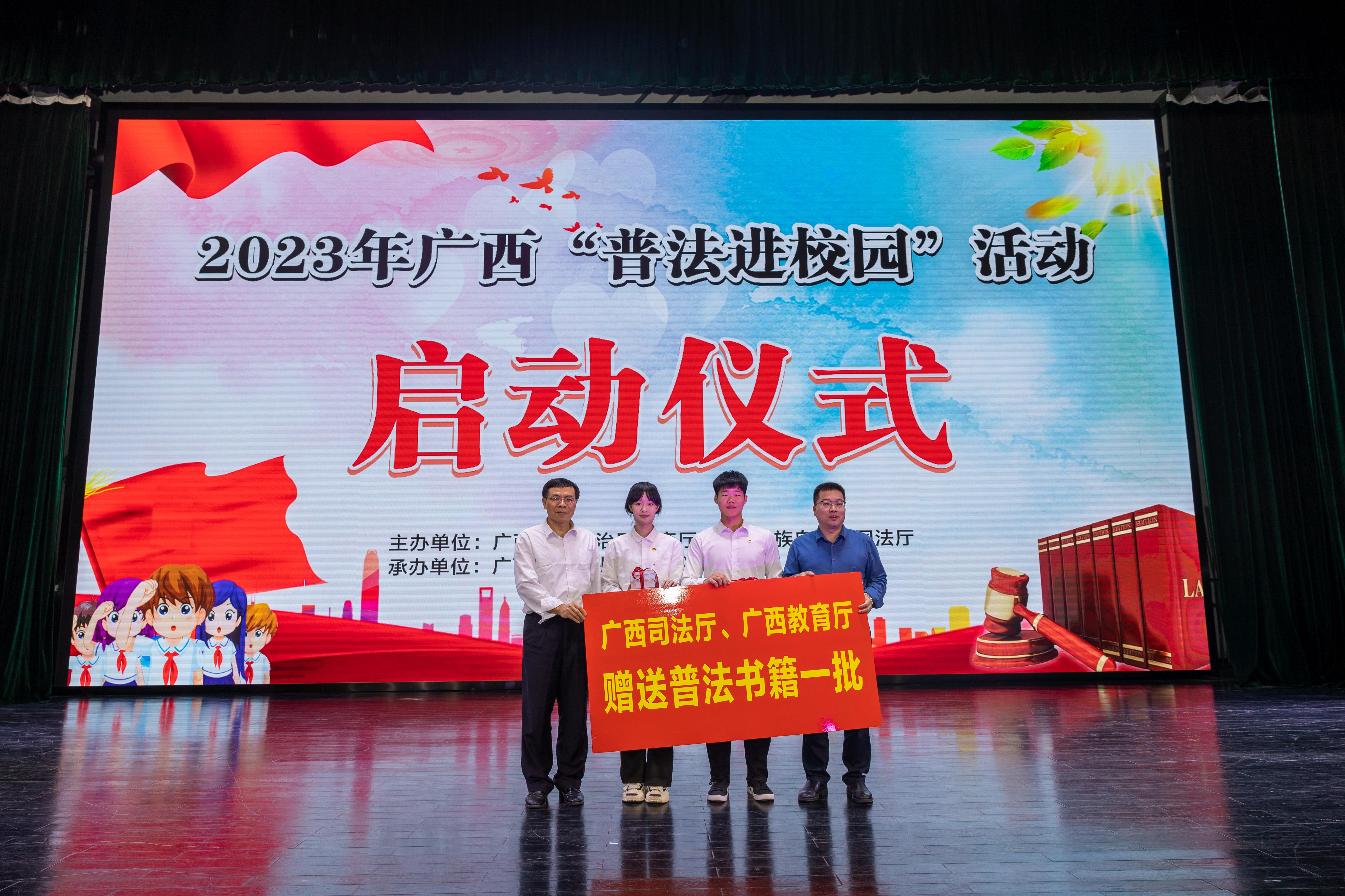自治区教育厅政策法规处李辉善处长宣布活动启动。启动仪式上,万象城官网党委书记李高岩宣读尊法守法倡议书;李辉善处长和陆建武处长向学生代表赠送普法书籍;参会领导为普法志愿者颁发绶带,并与志愿者合影留念。