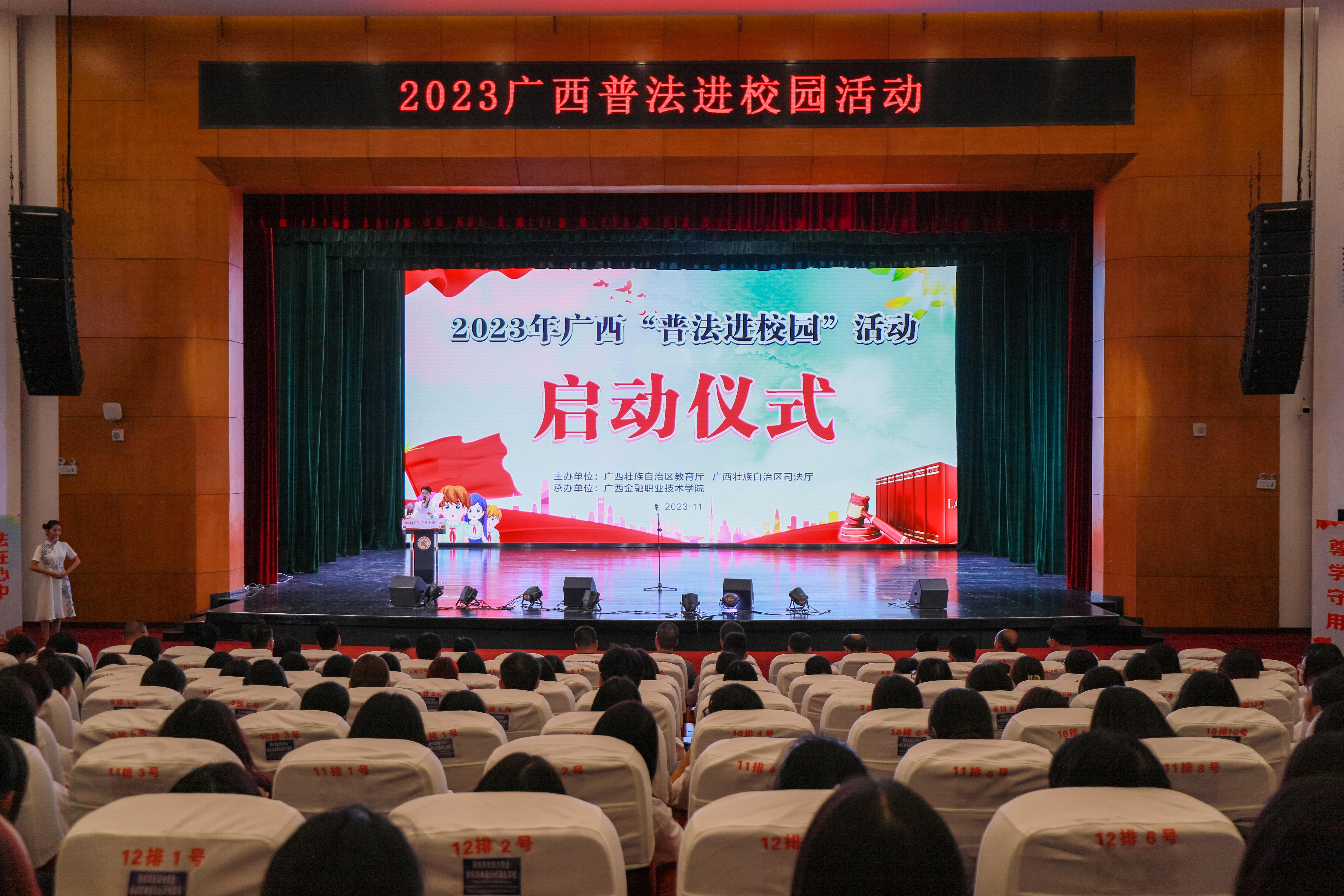 为全面学习贯彻党的二十大精神,营造尊法、学法、守法、用法的良好法治浓厚氛围,推动青少年法治教育常态化长效化,11月23日下午,由自治区教育厅、自治区司法厅主办,广西广播电视台承办、广西职业技术学院等10所中高职学校协办的2023年“普法进校园”主题活动启动仪式在万象城官网西校区国际会议中心成功举办。自治区教育厅政策法规处处长李辉善、自治区司法厅普法与依法治理处处长陆建武、广西广播电视台青少年普法栏目组人员、协办单位学校代表等出席启动仪式。