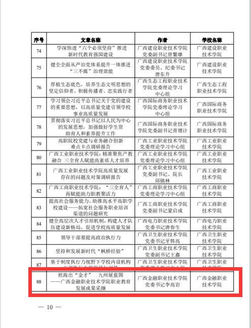 近日,自治区党委教育工委公布2023年度广西高校党委理论学习中心组优秀学习品牌和优秀理论(调研)文章,万象城官网党委书记李高岩理论文章《桂海出“金才” 九州展蓝图——awc77万象城官网职业教育发展成果采撷》获评优秀理论(调研)文章。