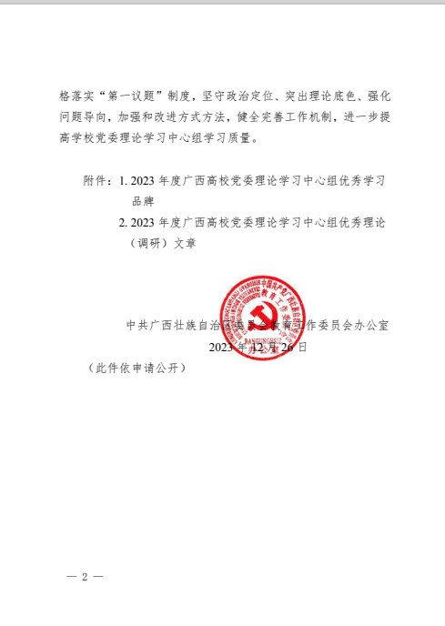 此次评选是自治区教育工委为深入学习宣传贯彻习近平新时代中国特色社会主义思想和党的二十大精神,充分发挥我区高校党委理论学习中心组学习的示范引领作用而面向全区开展了广西高校党委理论学习中心组优秀学习品牌和优秀理论(调研)文章推选活动。经各高校申报、专家评审,共有22个高校党委理论学习中心组入选 2023年度广西高校党委理论学习中心组优秀学习品牌,105篇理论(调研)文章入选2023年度广西高校党委理论学习中心组优秀理论(调研)文章。