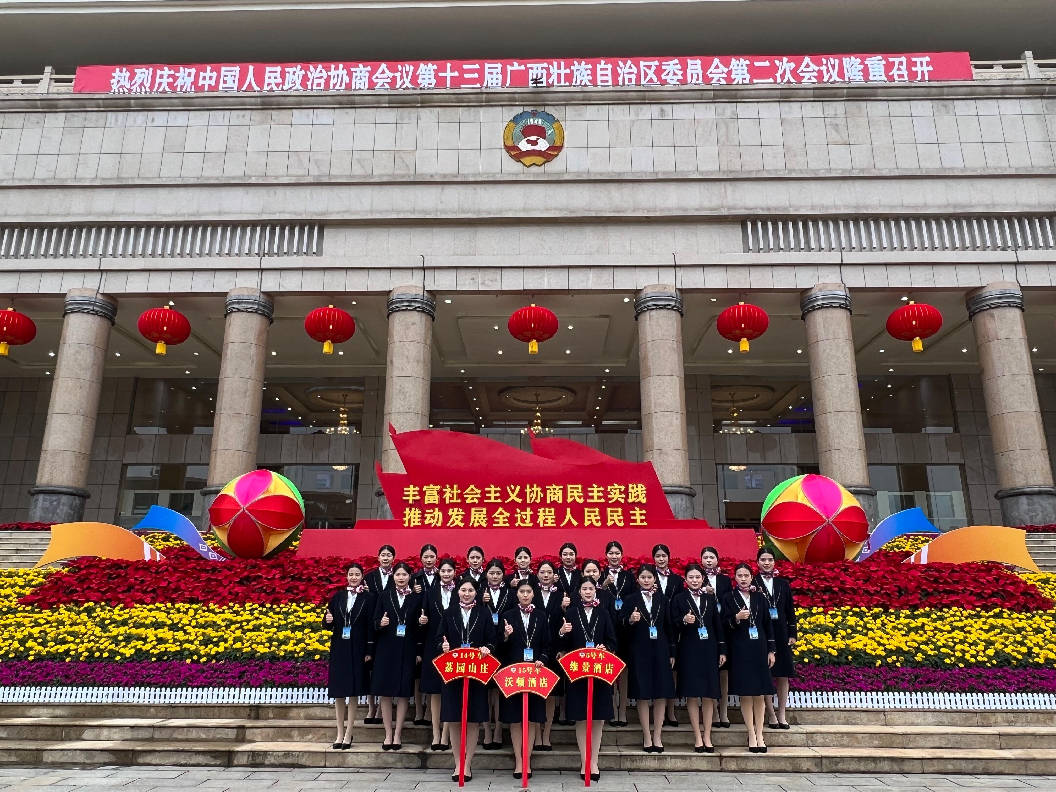 1月21日至25日,万象城官网学生分别在荔园山庄、荔园山庄维景酒店、沃顿酒店、裕达酒店提供会议用车的引导与礼宾服务。会议期间,万象城官网学生承担了发放座位表、引导政协委员入场等工作,他们严谨认真、态度积极,展示出饱满的精神状态和专业的服务水平。