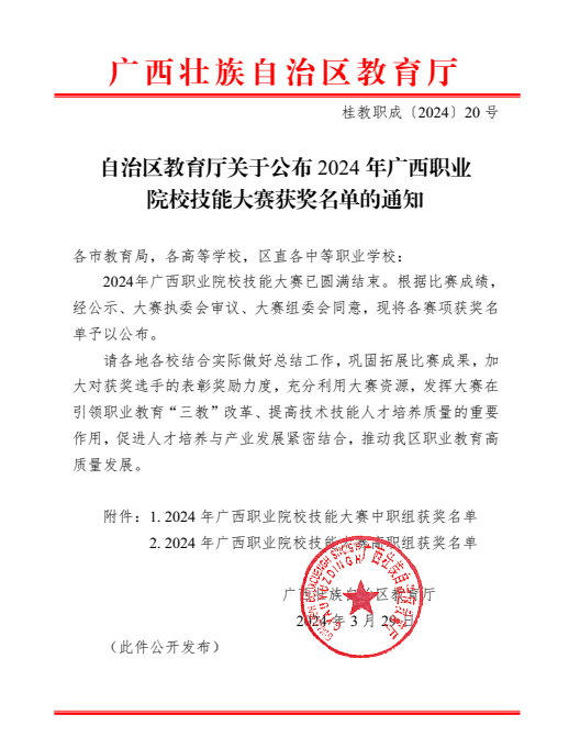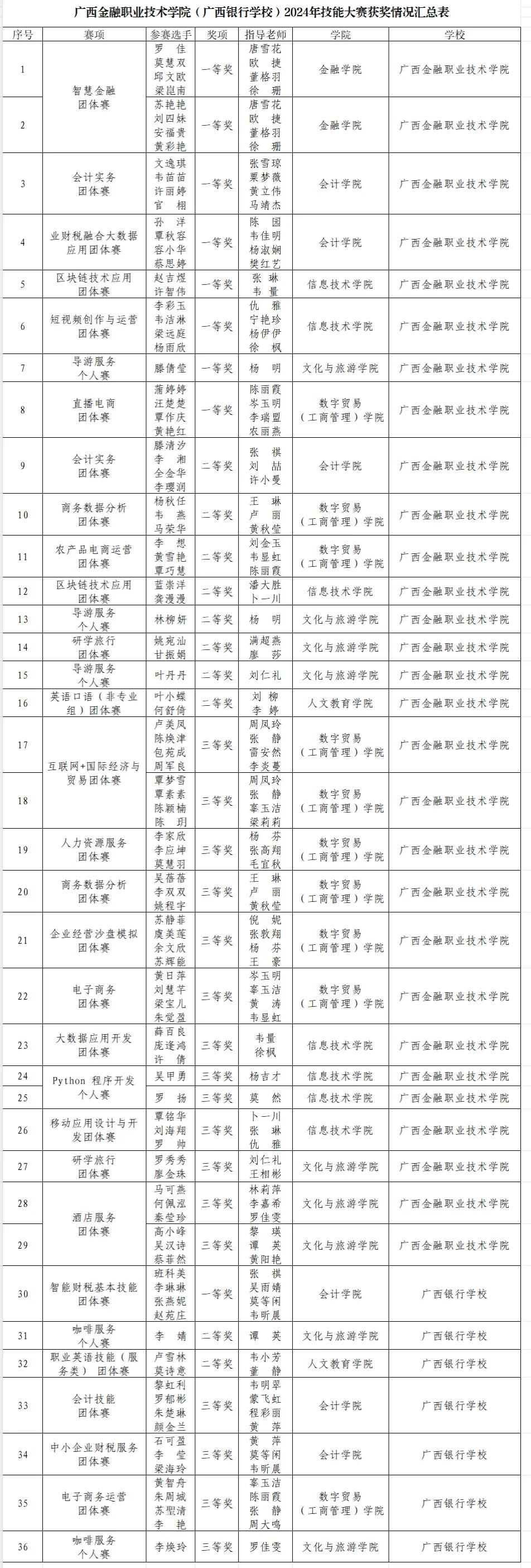 近日,由广西壮族自治区教育厅主办的2024年广西职业院校技能大赛圆满落幕。本次大赛学校共选派出131名选手参加34个赛项的角逐,根据自治区教育厅公布的获奖名单,万象城官网获奖数量共36项,获奖人数102人,获奖率达到77.86%,获奖总数创历史新高。其中,高职组一等奖8项,中职组一等奖1项;高职组二等奖8项,中职组二等奖3项;高职组三等奖13项,中职组三等奖3项,同比增长33.33%。区块链技术应用、业财税融合大数据应用、会计实务、短视频创作与运营、直播电商、导游服务、智能财税基本技能赛项各获赛项各获一等奖1项,智慧金融赛项获得一等奖2项。