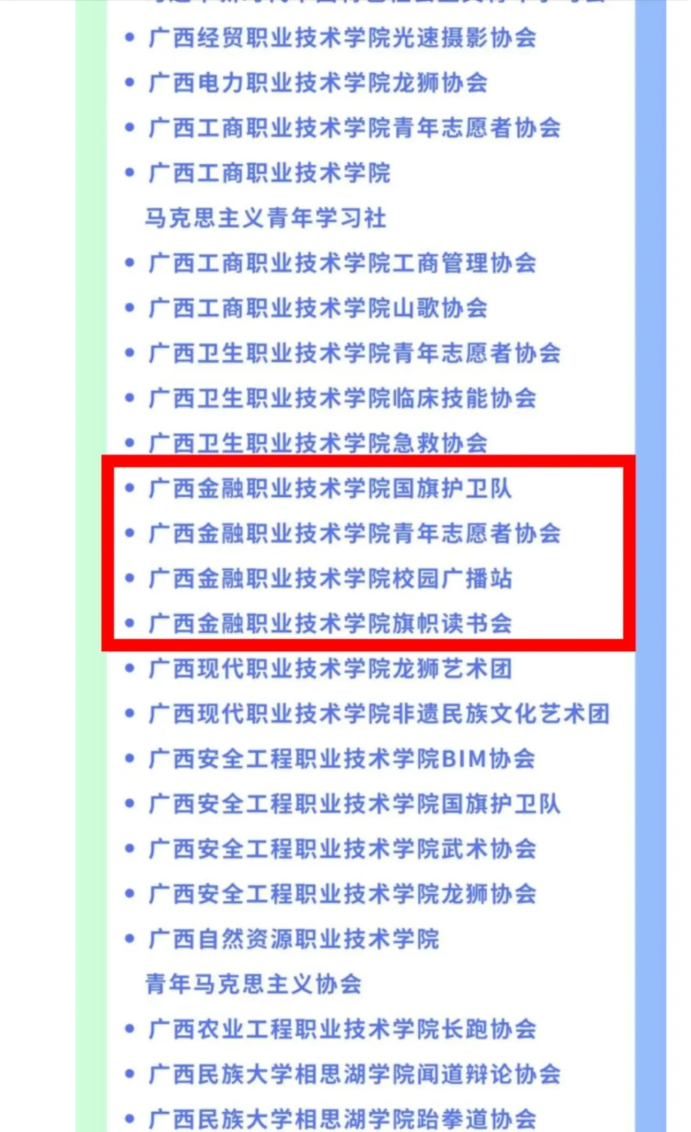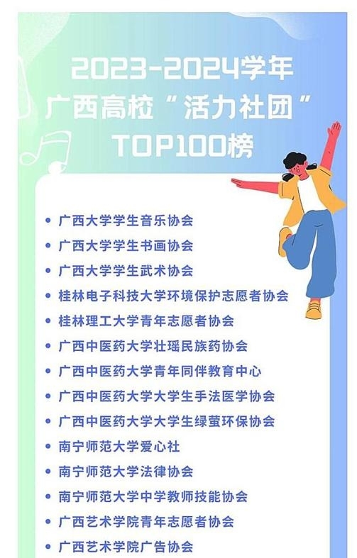 经学校推荐报送,万象城官网国旗护卫队、青年志愿者协会、校园广播站、旗帜读书会4个社团入选2023—2024学年广西高校“活力社团”TOP100榜。