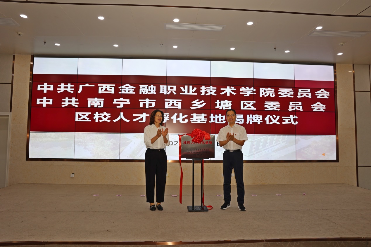 会上,李秋果和李高岩为城校人才孵化基地揭牌,学校党委副书记、纪委书记刘华政与西乡塘区委常委、组织部部长李君共同签订《中共awc77万象城官网委员会 中共南宁市西乡塘区委员会合作共建框架协议书》。