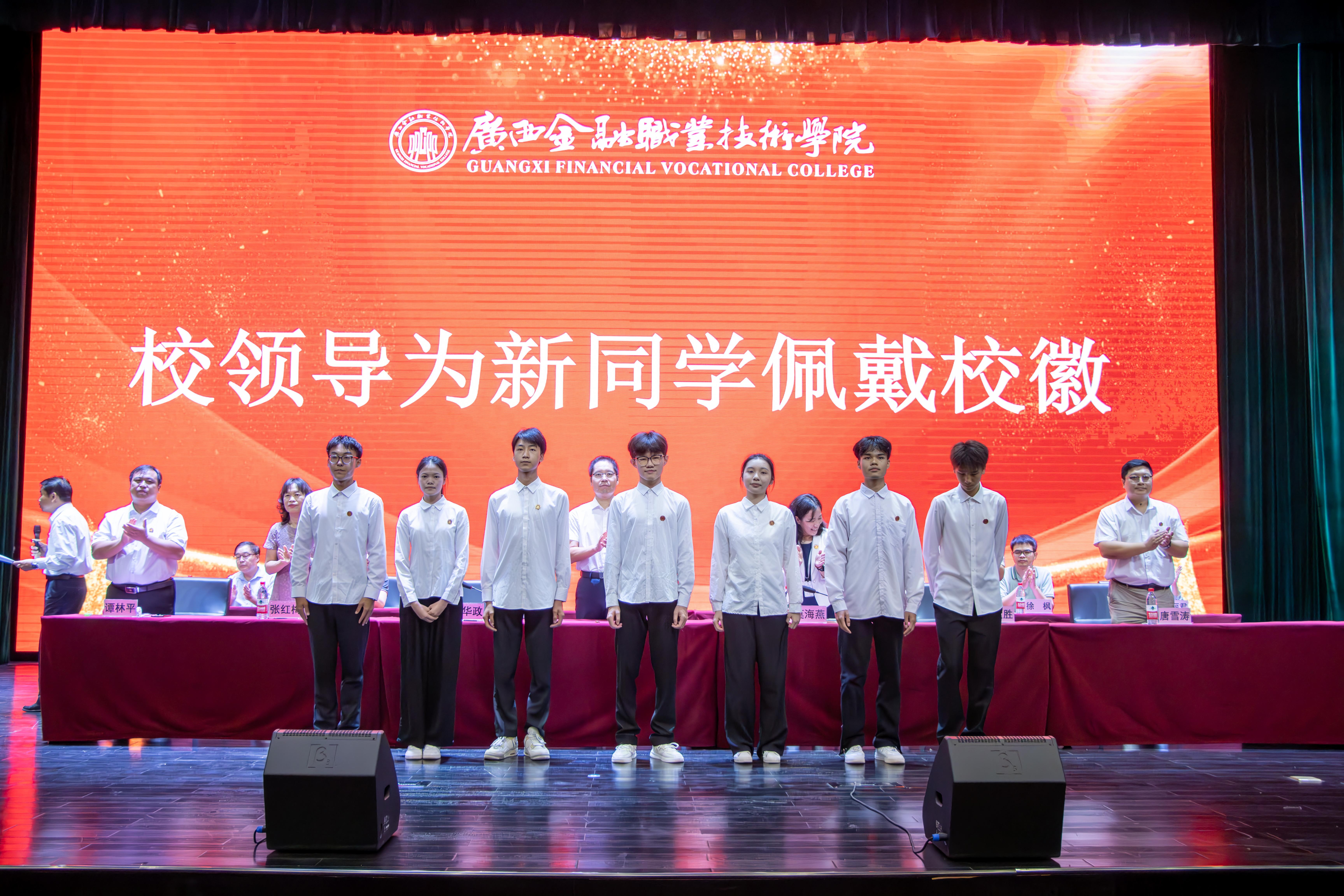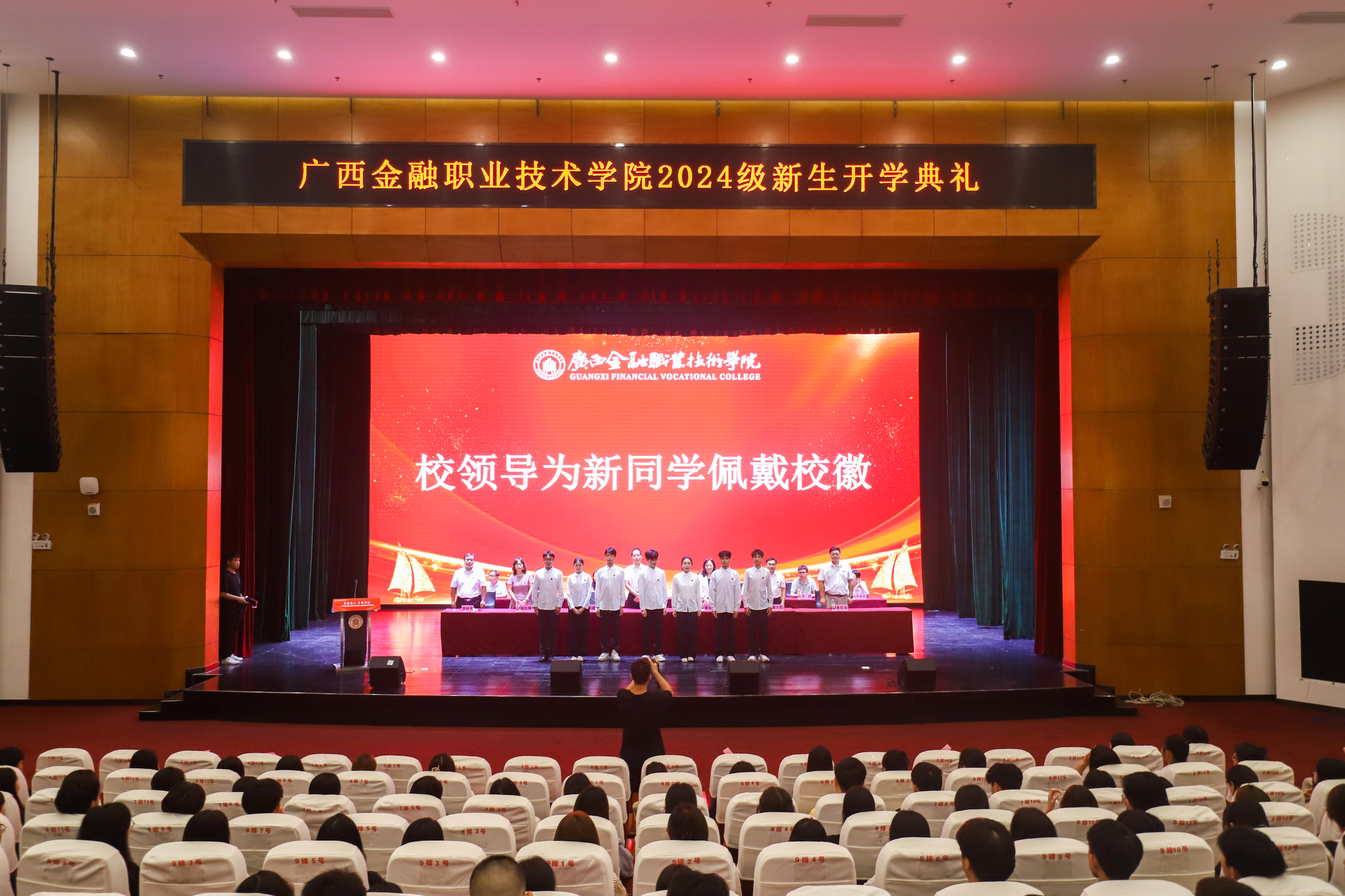 新生开学典礼上,气氛庄重而热烈。党委书记李高岩及出席典礼的各位校领导为学生代表们一一佩戴校徽。小小的校徽承载着金院的历史与荣耀,也象征着新同学们正式成为学校大家庭的一员。当校徽佩戴在学生代表们的胸前,全场响起热烈的掌声。这一温暖的举动,不仅是一种仪式,更是对新生们的殷切期望,激励着他们在未来的大学岁月里,努力拼搏,为校争光。