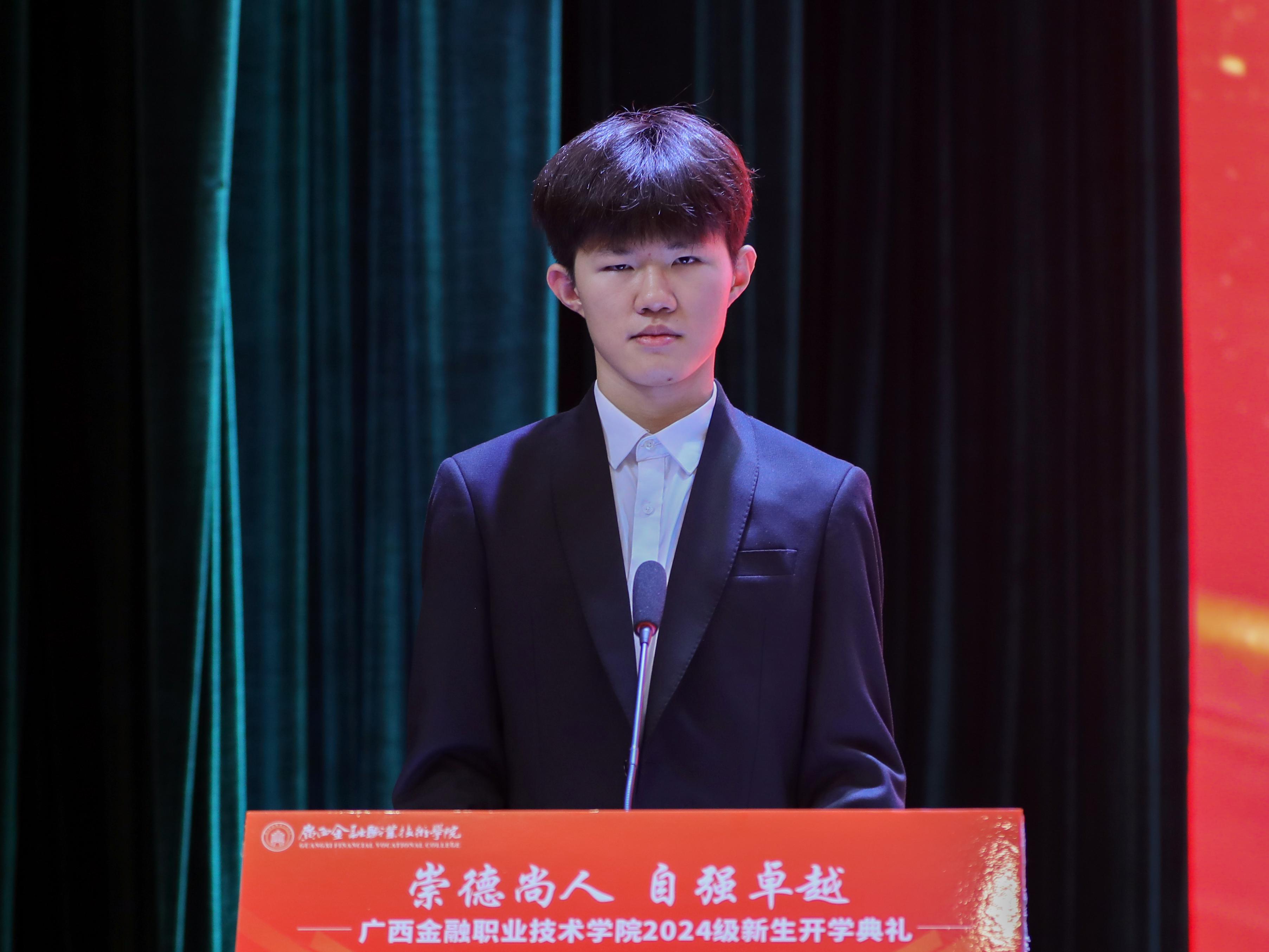 投资与保险学院张树壮同学作为新生代表发言。他感激学校、老师们的亲切关怀以及学姐、学长们的热情帮助,同时表示在未来的三年中定将奋力冲刺,追求卓越,不负韶华,做求知勉行的优秀金院人。