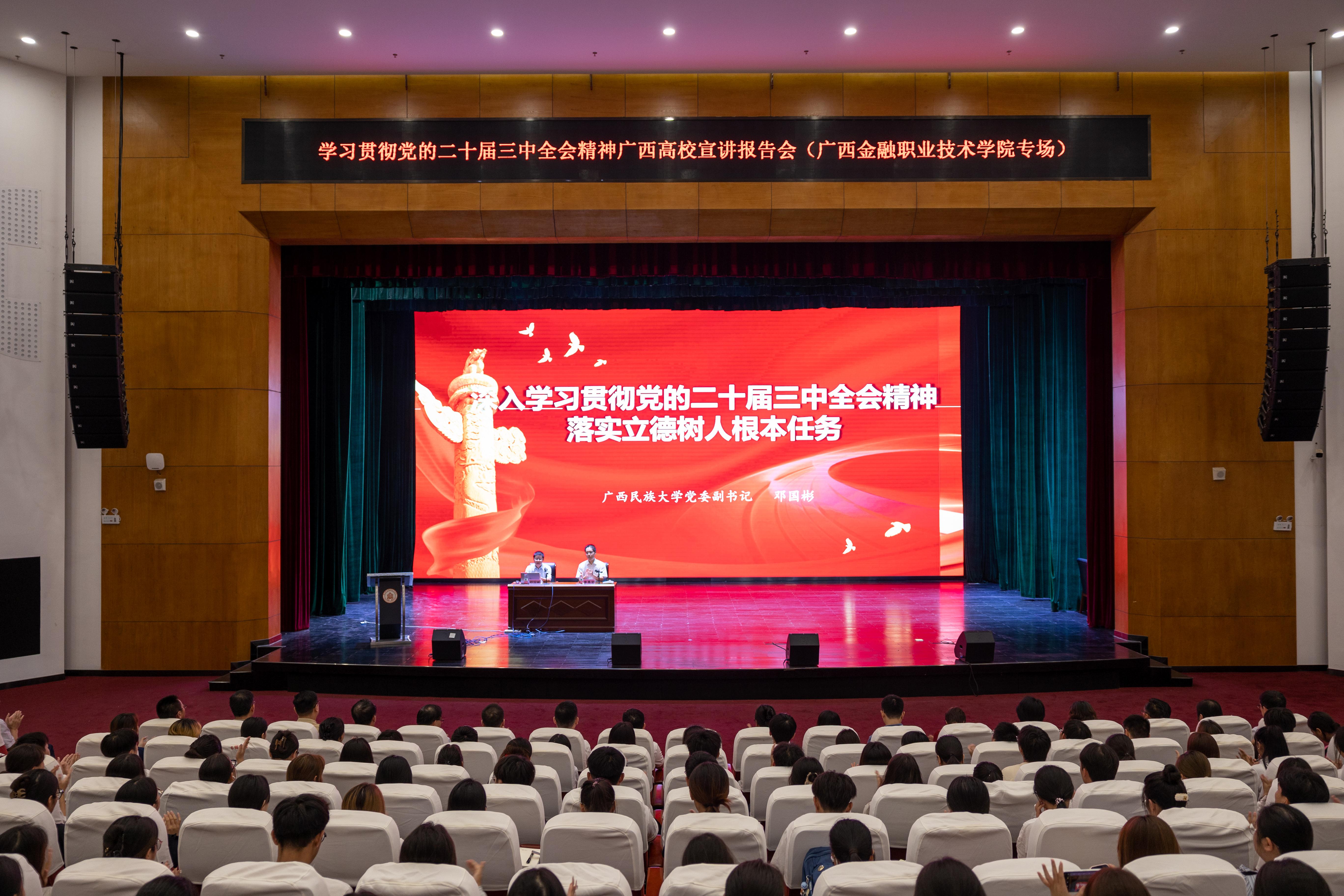 9月20日下午,学习贯彻党的二十届三中全会精神广西高校宣讲报告会在万象城官网西校区国际会议中心举行。广西民族大学党委副书记、研究员邓国彬作宣讲报告。学校党委书记李高岩主持报告会。