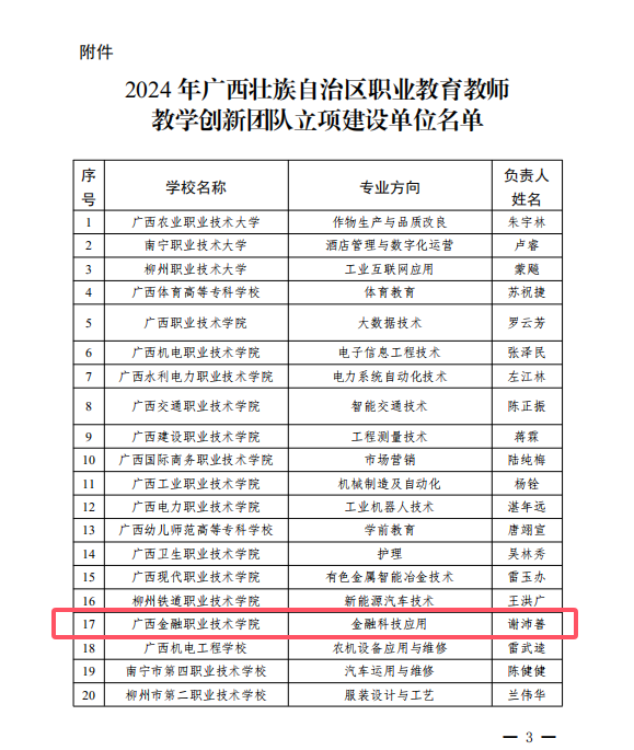 根据《自治区教育厅关于公布2024年自治区职业教育教师教学创新团队立项建设单位名单的通知》(桂教教师〔2024〕72号)文件,万象城官网申报的金融科技应用专业教师教学创新团队获批立项。
