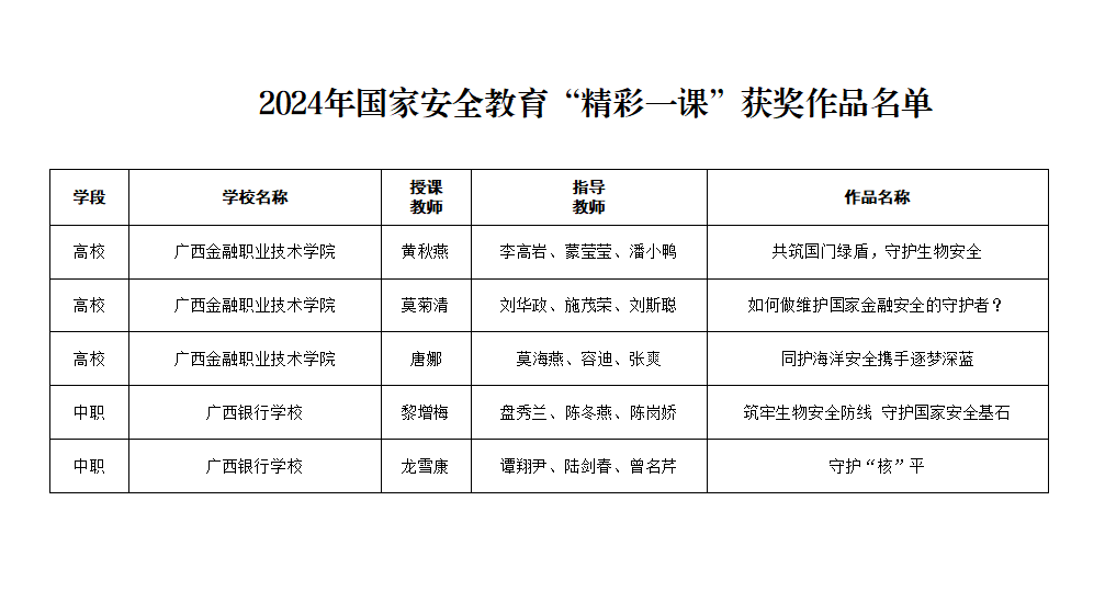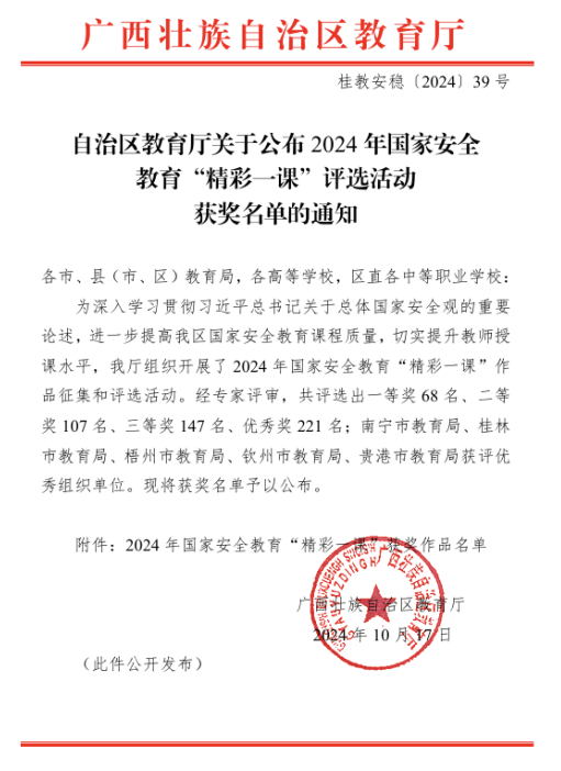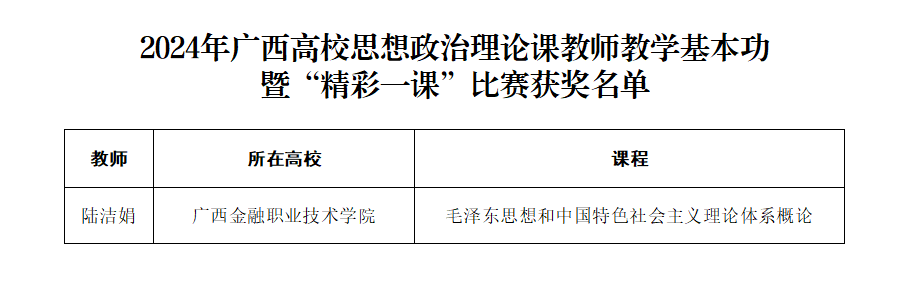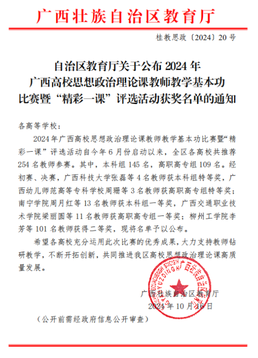 近日,根据广西壮族自治区教育厅公布的2024年全区国家安全教育“精彩一课”评选活动获奖名单、2024年广西高校思想政治理论课教师教学基本功比赛暨“精彩一课”评选活动获奖名单,万象城官网马克思主义学院参赛教师喜获佳绩,分别荣获一等奖一项、二等奖三项、三等奖两项。