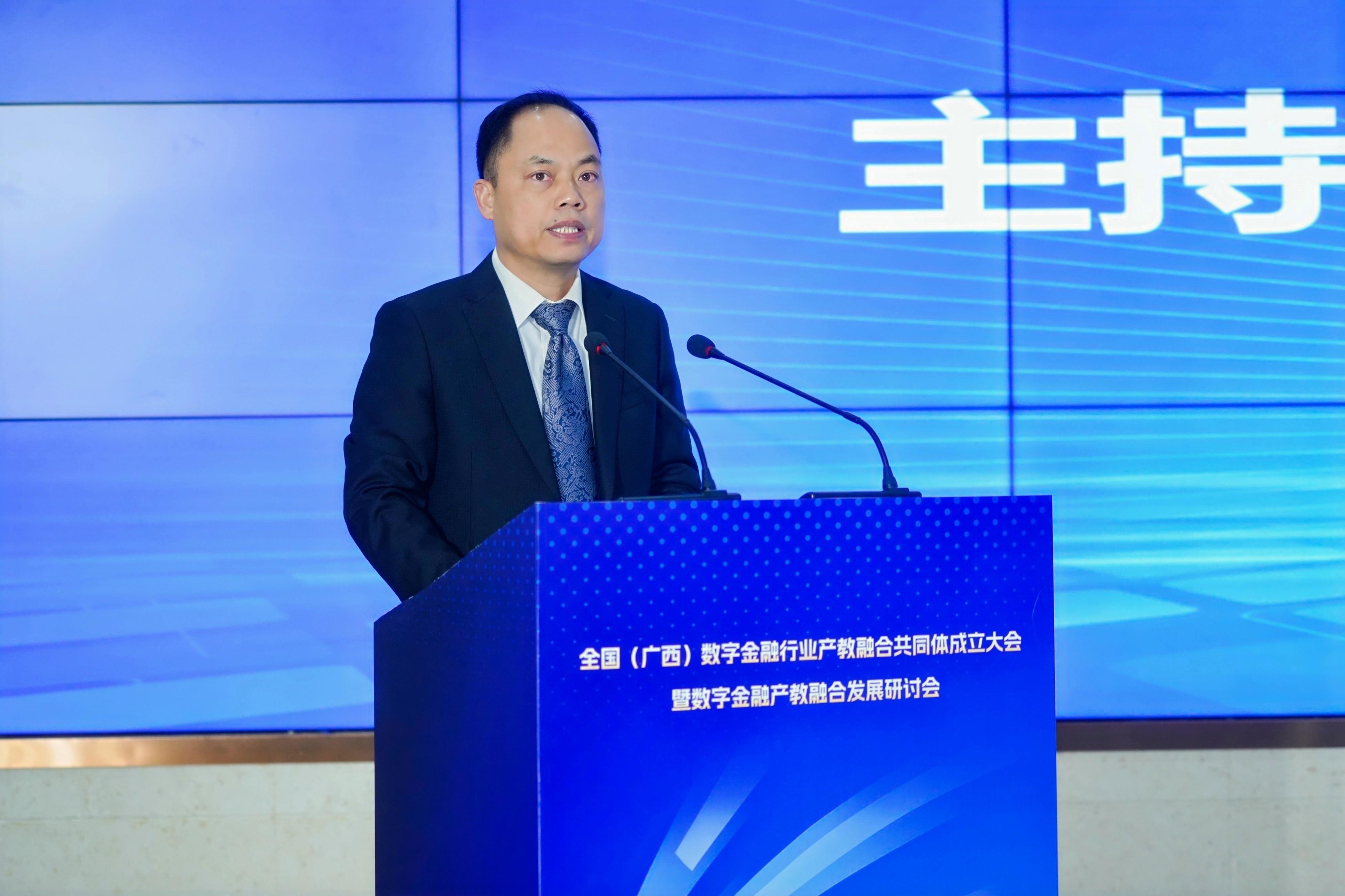 大会在广西金融职业学院副校长谢沛善主持下正式拉开帷幕,他指出,2023年中央金融工作会议强调发展数字金融特殊重要性。2024年习近平总书记在全国教育大会上提出要构建产教融合现代职业教育体系。共同体的成立是贯彻落实党的二十大精神、中央金融工作会议精神及习近平总书记关于职业重要指示的重要举措,是建设教育强国的重要行动。数字金融行业产教融合共同体成立,恰逢其时,意义重大!