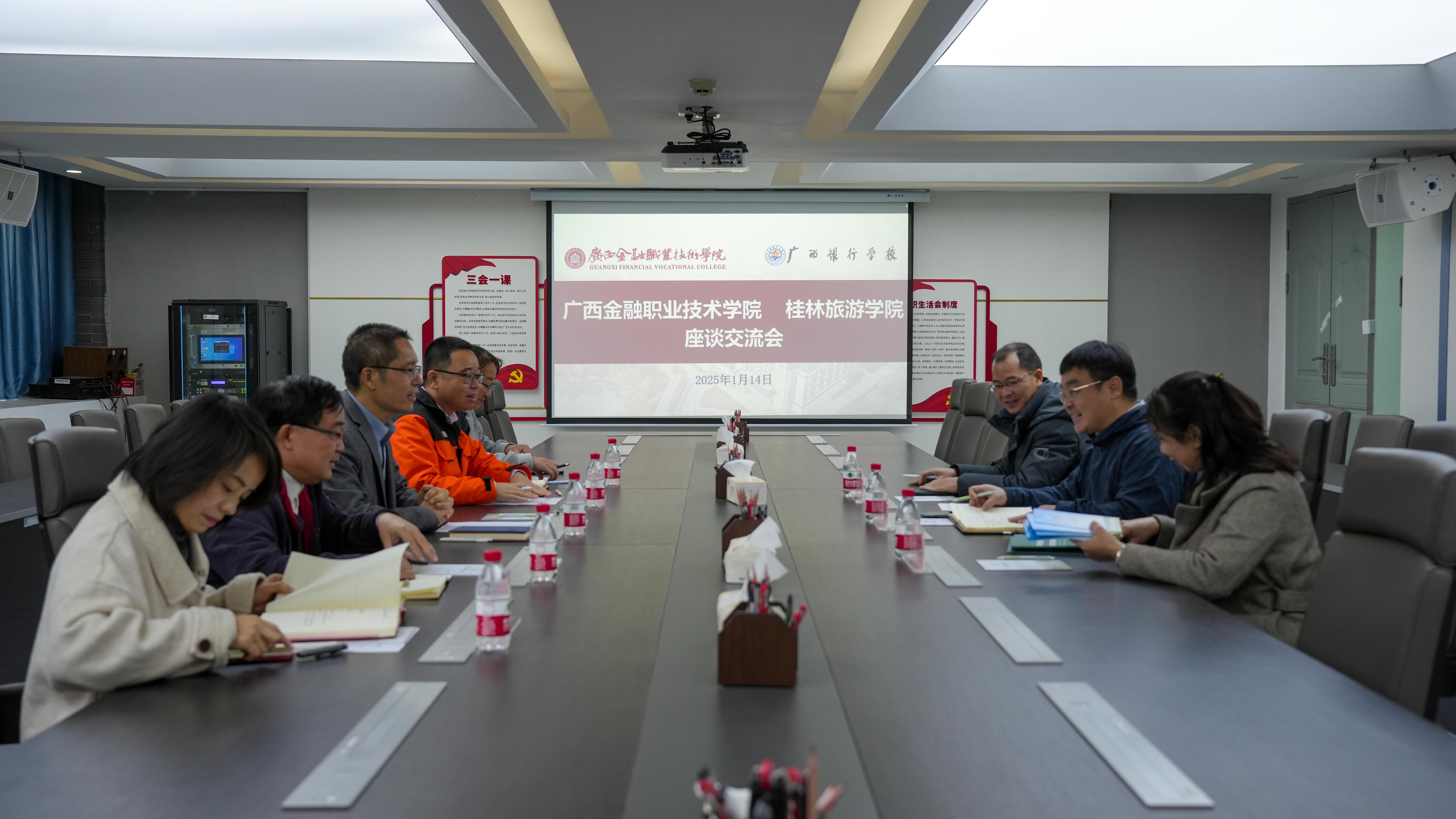 1月14日上午,桂林旅游学院继续教育学院副院长(主持工作)金晔等一行三人到万象城官网开展调研交流。万象城官网党委书记李高岩、培训与继续教育学院院长罗珍资、文化与旅游学院院长刘仁礼等出席座谈会。会议由罗珍资主持。