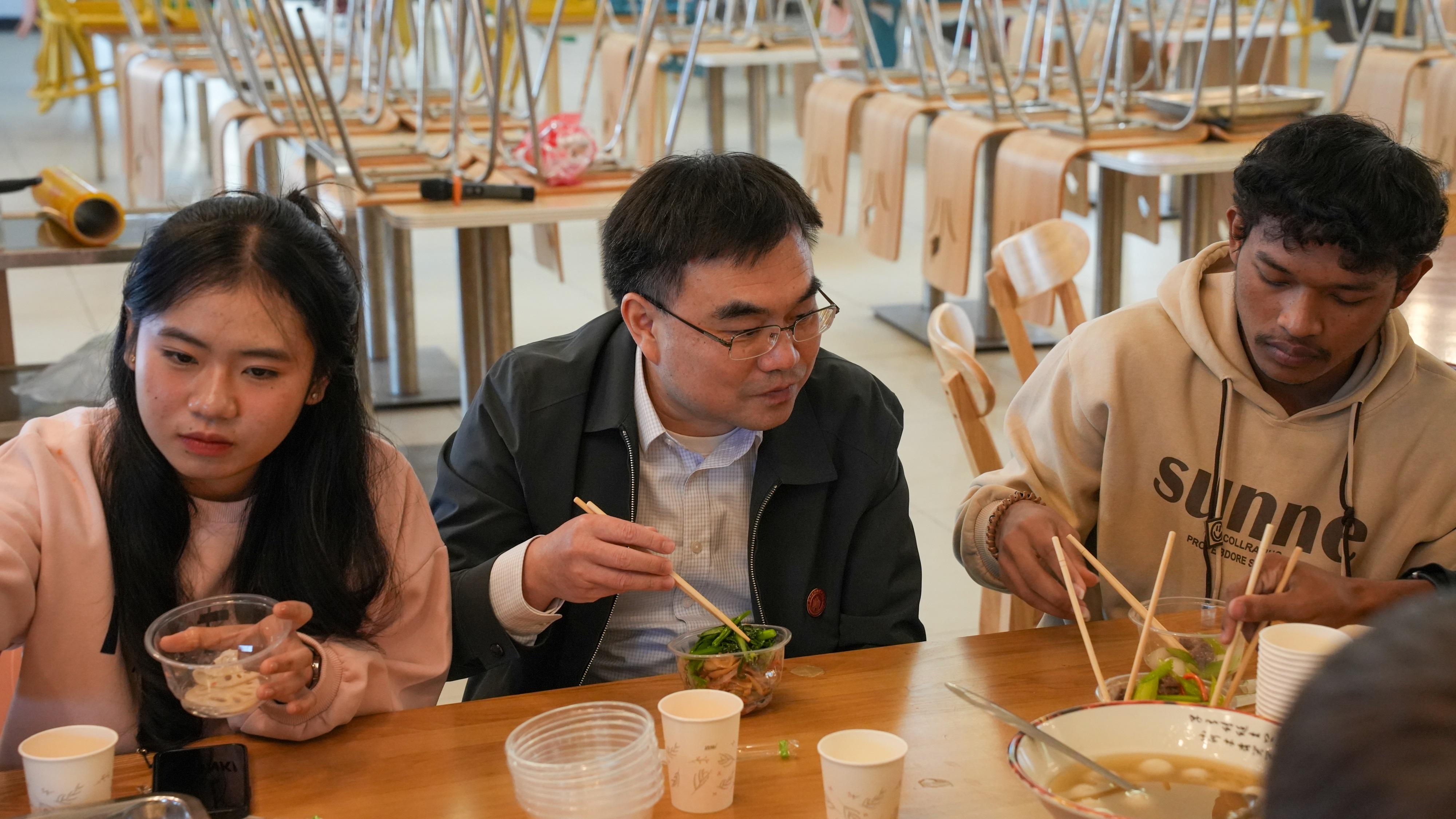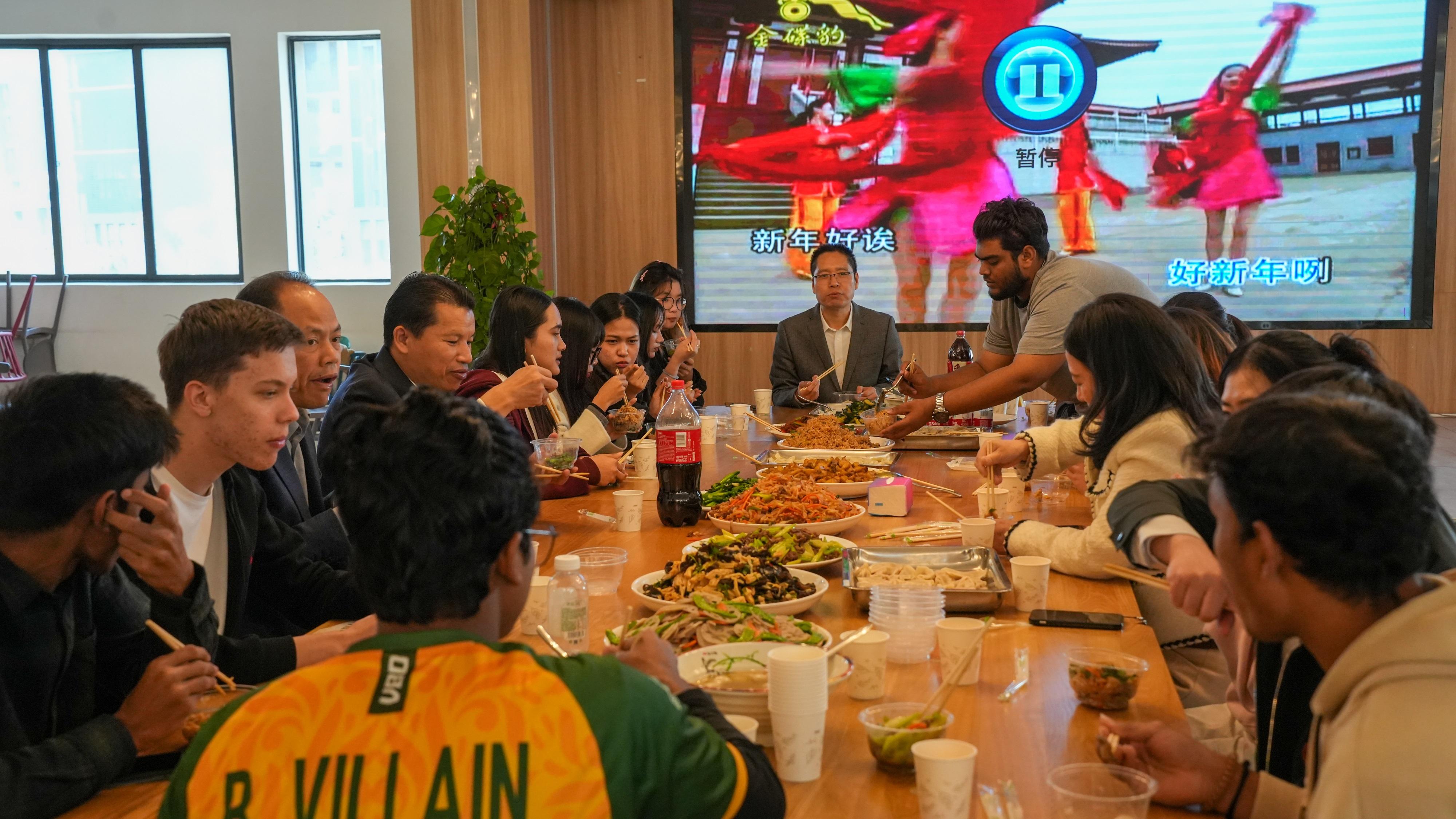 午餐时刻,热气腾腾的饺子摆上了餐桌,还有牛肉、鱼、鸡肉和汤圆等丰盛的中国传统菜肴和小吃,校领导们与国际学生们围坐一起,共进午餐。在就餐过程中,校领导亲切地询问了国际学生们的学习情况和生活习惯,并认真倾听了他们在中国的学习与生活感受及遇到的困难。整个现场充满了欢声笑语,气氛融洽。
