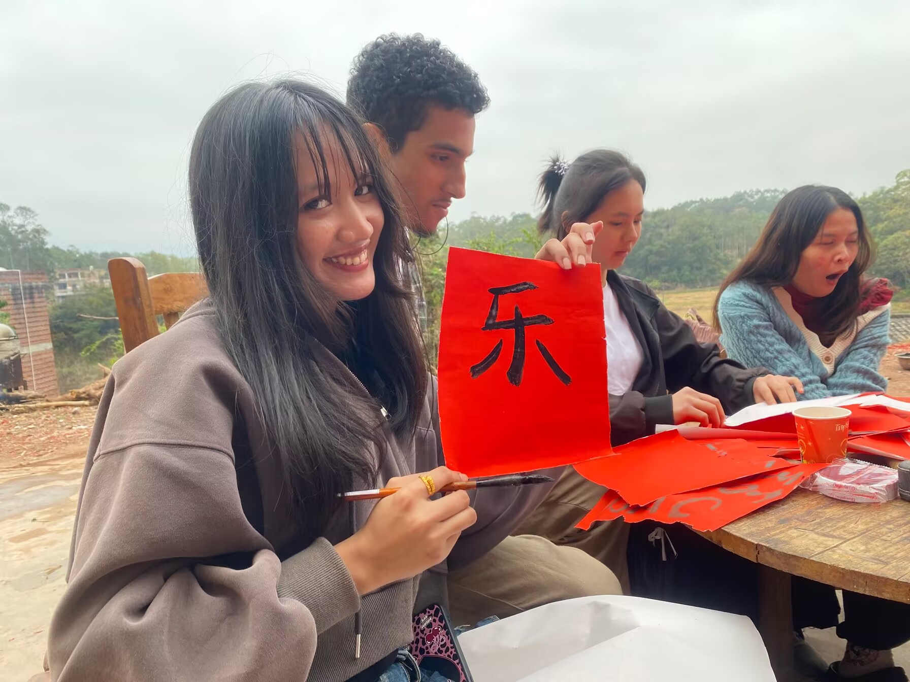 随后,大家来到张冠老师家中,体验和学习毛笔字的书写。在老师的耐心指导下,学生们手执毛笔,蘸墨挥毫,一笔一划地书写着汉字。红纸浓墨间,一个个形态各异的汉字跃然纸上,虽然笔触略显稚嫩,但每一个字都饱含着他们对中华传统文化的向往与崇敬,也寄托着对学校和老师的美好祝福。