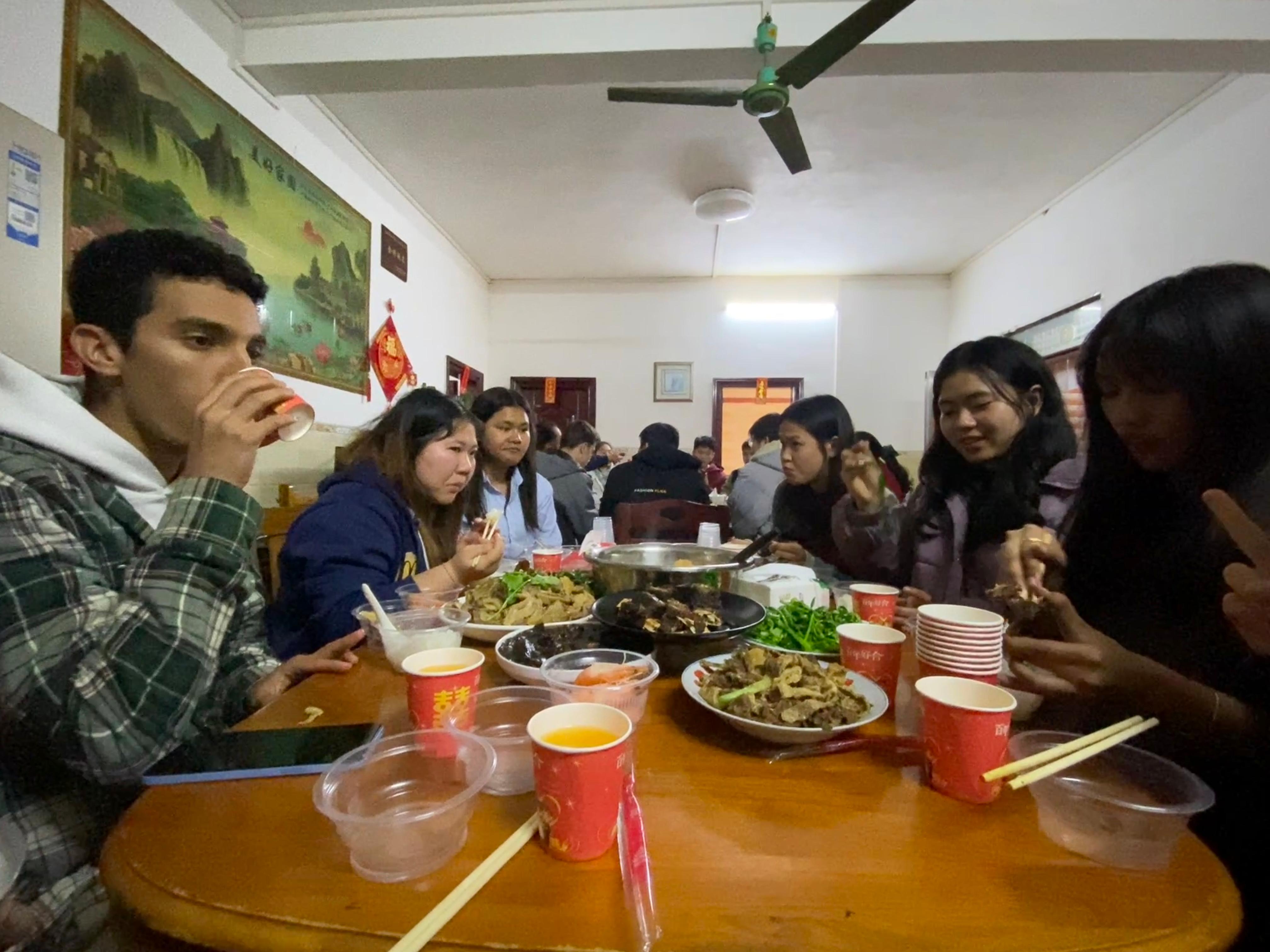 正月初六,学生们和张冠老师品尝当地特色传统火锅,大家围坐在一起,举杯相庆,互相祝福,传递浓浓的情谊。互赠春节礼物后,学生们踏上返校的归途,表示此次活动非常有意义,希望下次还能参加。