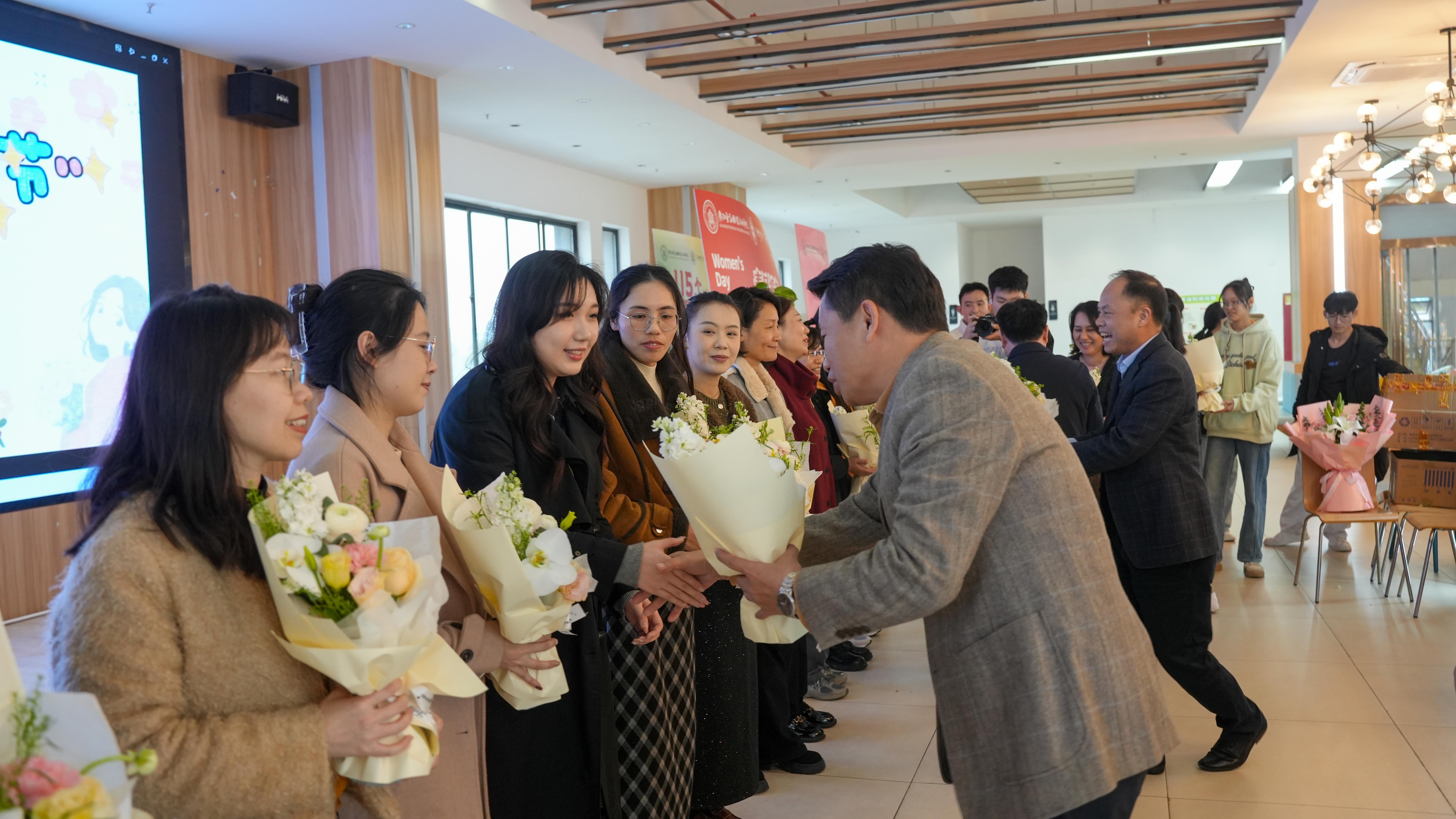 随后李高岩书记代表全体男教职工向以莫海燕校长为代表的女教职工们献上鲜花,刘华政副书记、谢沛善副校长、潘大胜副校长为各工会小组女职工代表献上鲜花,这一温馨举动让现场气氛更加融洽。
