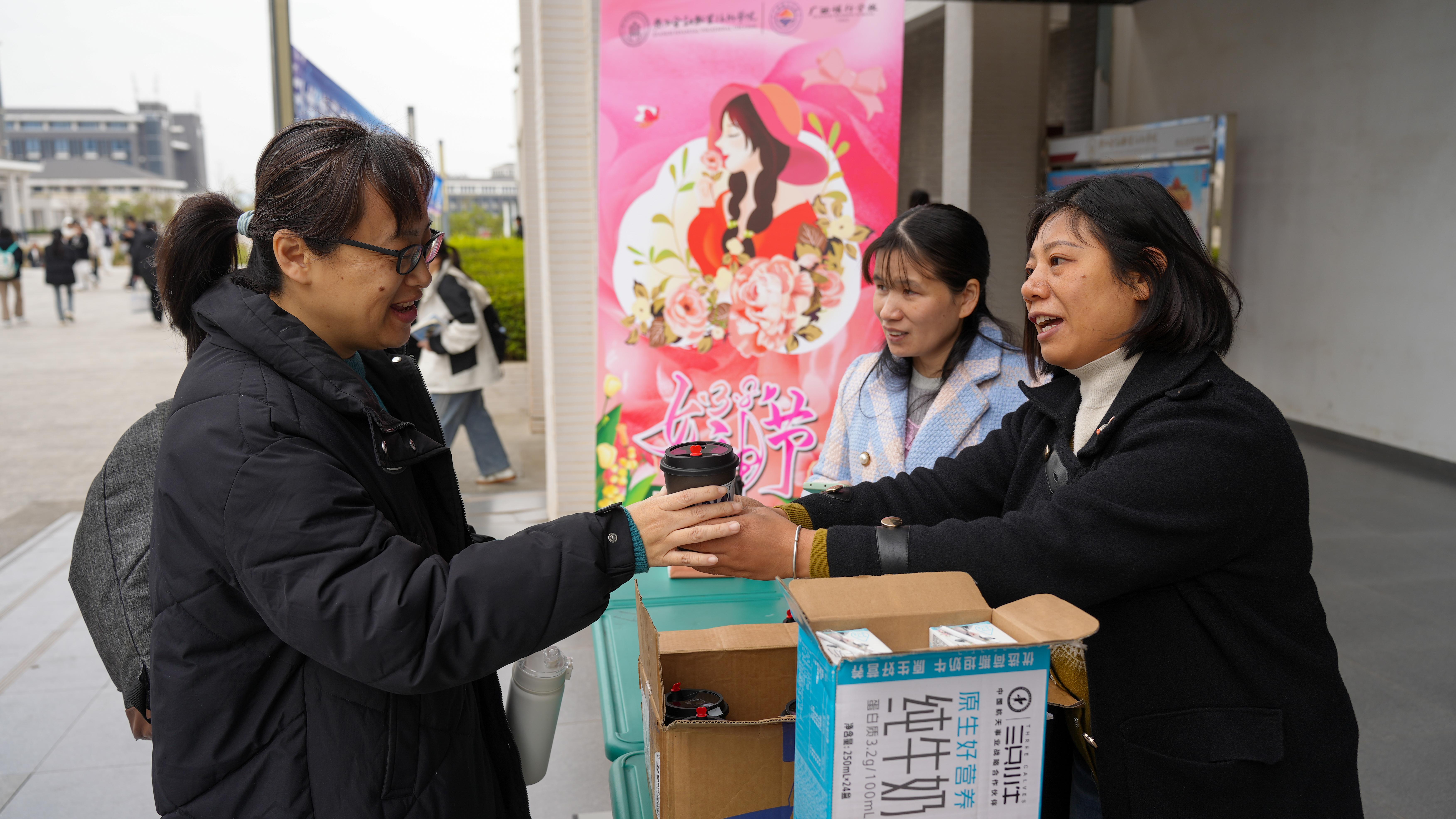 上午,学校工会在1 号教学楼、4 号教学楼以及办公楼对一线教职工进行节日慰问。一杯杯热气腾腾的咖啡、一盒盒营养丰富的牛奶被递到女教职工们手中,同时送上的还有饱含深情的节日祝福。前来上课和办公的女教职工们纷纷驻足,笑容在她们脸上绽放,惊喜之情溢于言表,她们感慨这份贴心的关怀如同春日暖阳,驱散了工作的疲惫。