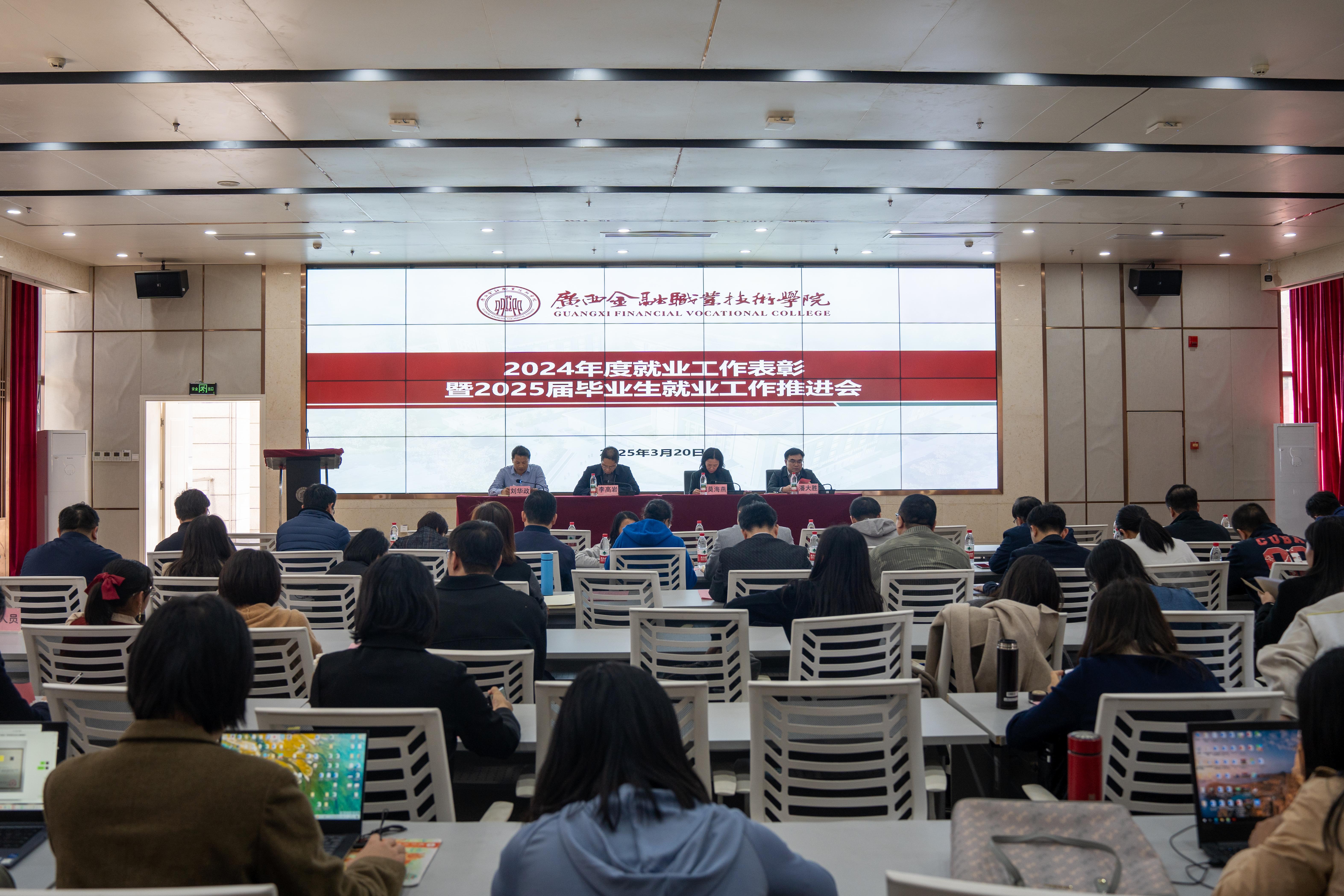 2025年3月20日下午,万象城官网在西校区道德大讲堂召开了2024年度就业工作表彰会暨2025届毕业生就业工作推进会,党委书记李高岩、校长莫海燕出席会议并讲话,会议由党委副书记、纪委书记刘华政主持。校领导、各二层单位负责人、招生就业处全体成员、二级学院专业负责人、就业专干、2024届及2025届辅导员等参加会议。