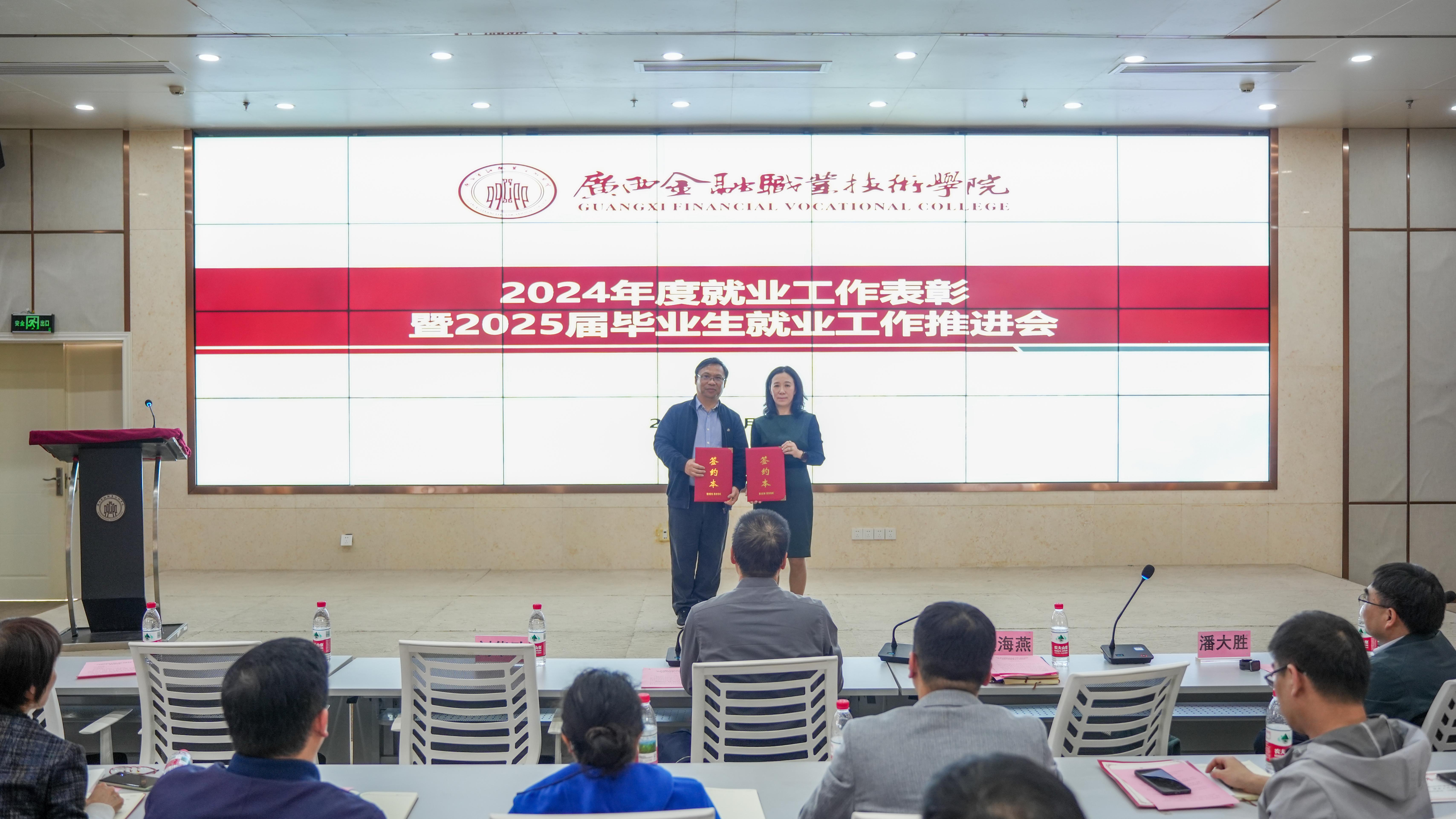 随后,党委书记李高岩、校长莫海燕、副校长潘大胜为就业工作先进集体和先进个人颁发了荣誉证书。校长莫海燕与招生就业处、各二级学院签订了2025届毕业生就业工作目标责任书,明确了各部门在毕业生就业工作中的职责和任务,为2025届毕业生就业工作奠定了坚实的基础。
