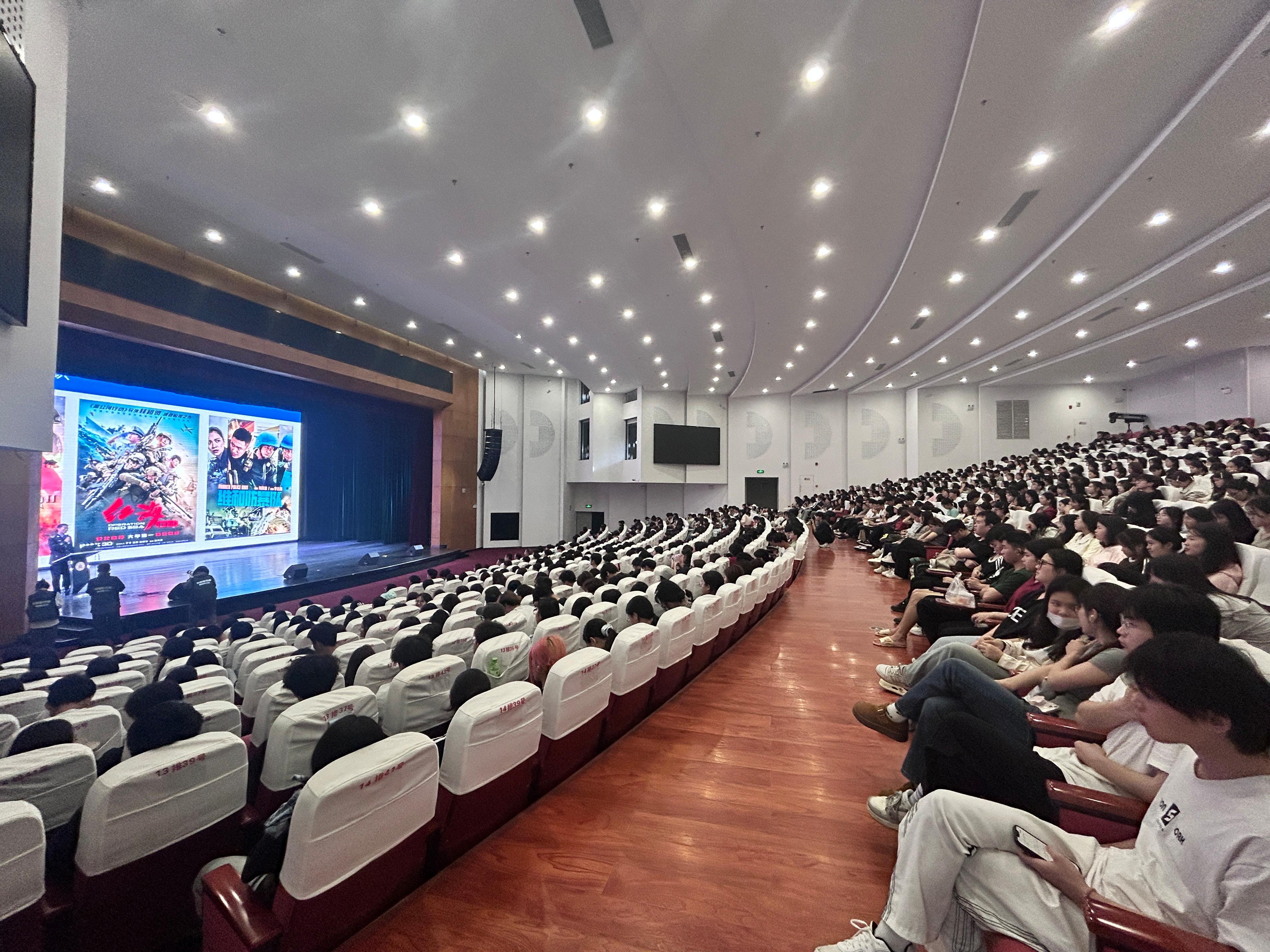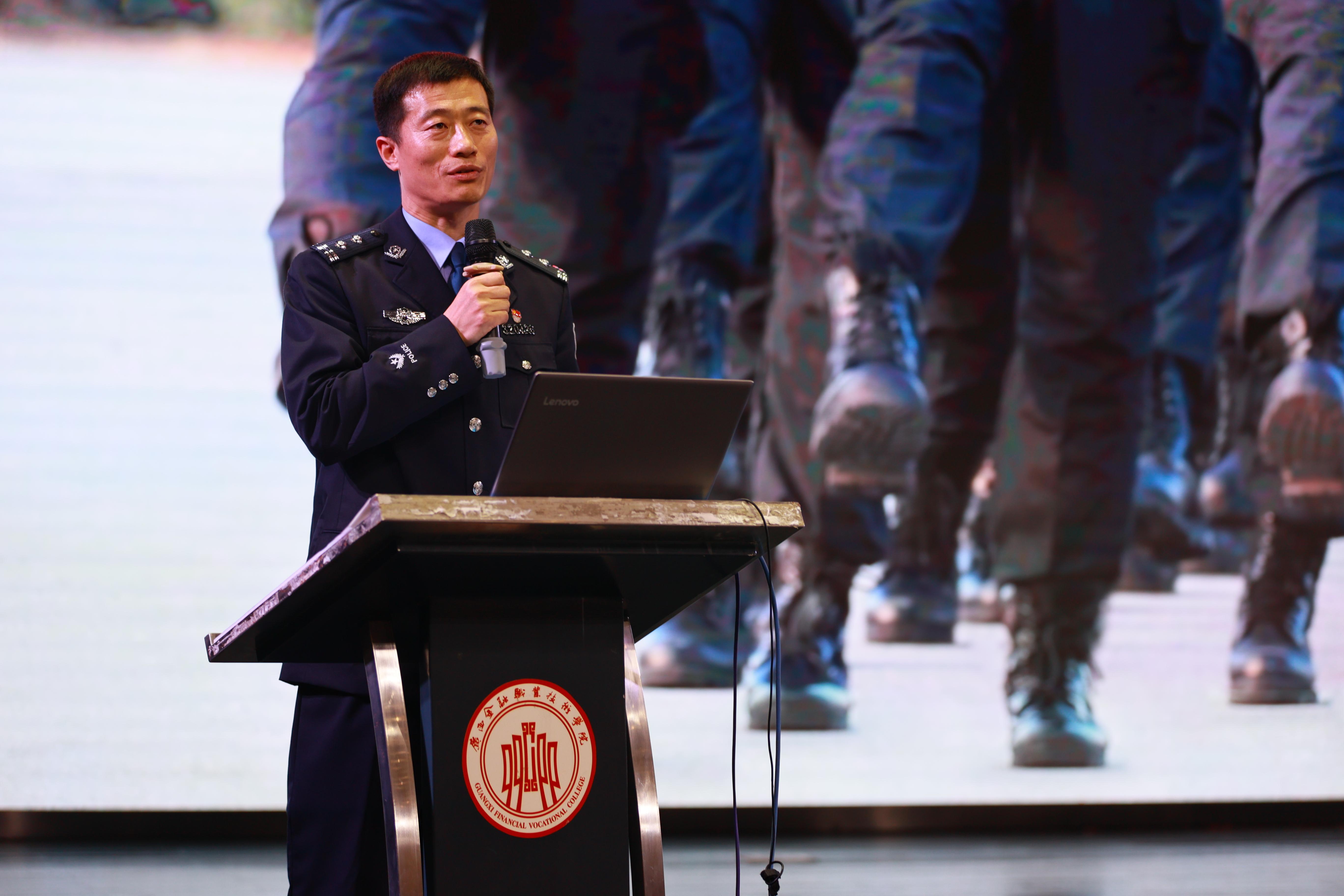 分享会开场,现场播放了介绍中国第五支赴利比里亚防暴队基本情况的视频,让同学们对维和任务有了初步的认识。随后,主讲人广西出入境边检总站、一级警长、警务实战教官吴茂辉教官进行视频讲解。