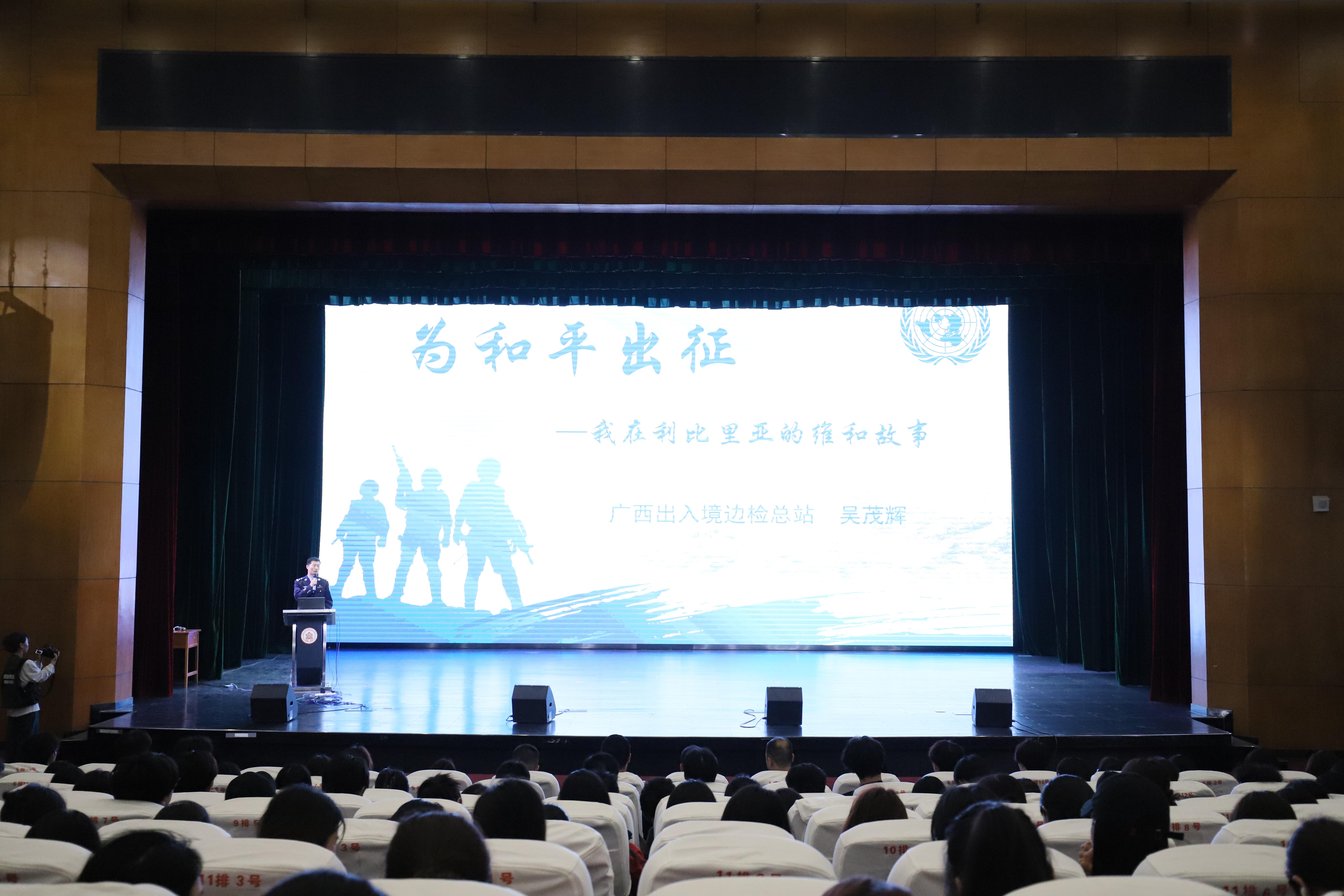 2025年3月24日晚,由awc77万象城官网、广西出入境边防检查站轮训大队共同主办,awc77万象城官网“一站式”学生社区服务中心承办,“数智社区”辅导员工作室协办的“为和平出征——我在利比里亚的维和故事”国防分享会在万象城官网西校区国际会议中心举行,广西出入境边防检查总站轮训大队副大队长罗起宝、广西出入境边防检查总站轮训大队训练处副处长梁亮锋、万象城官网党委学生工作部(学生工作处、武装部)部长唐雪涛出席了本次活动。
