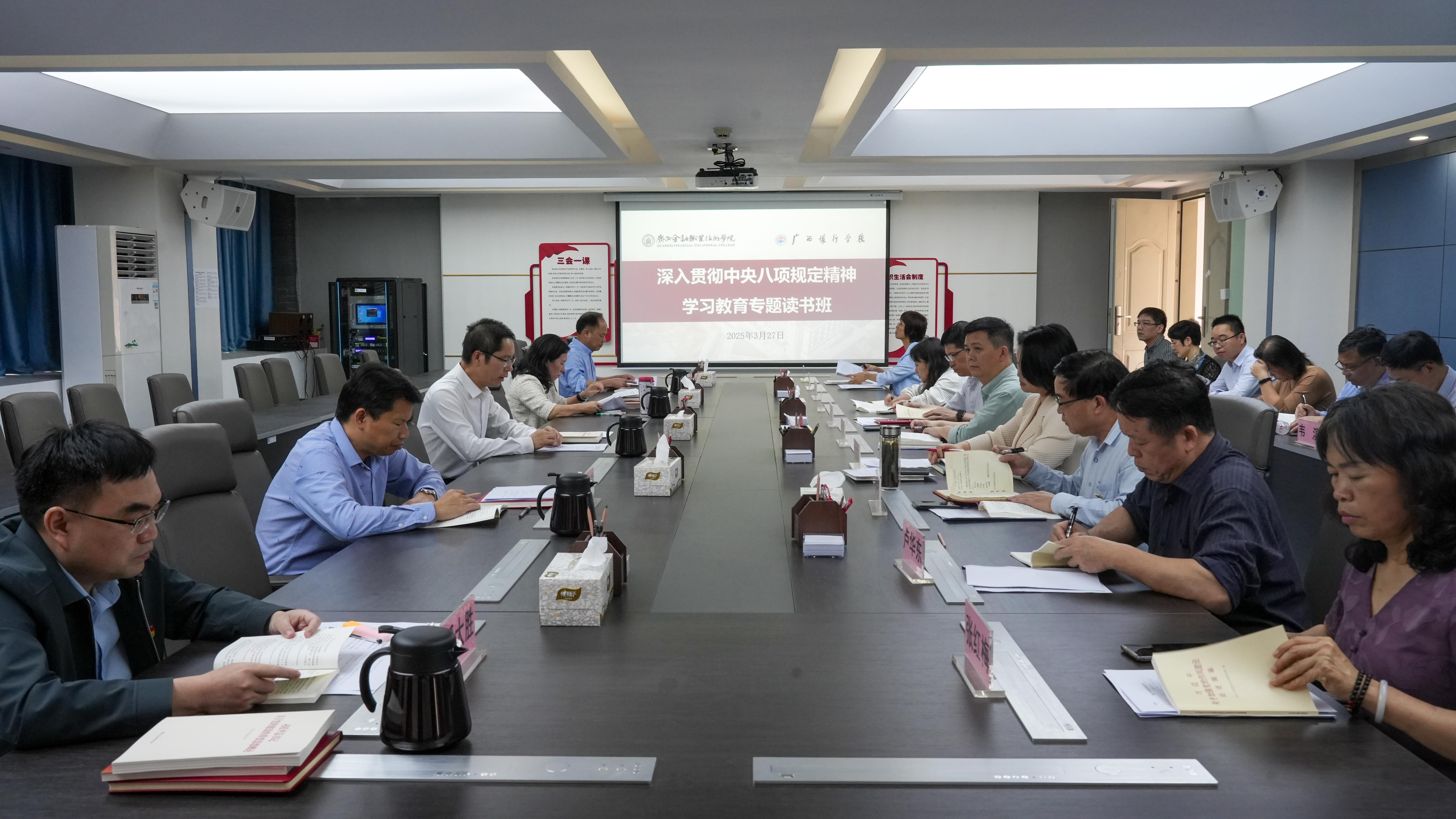 按照深入贯彻中央八项规定精神学习教育总体安排,3月26日至27日,万象城官网党委书记李高岩主持召开深入贯彻中央八项规定精神学习教育专题读书班,认真学习习近平总书记关于加强党的作风建设的重要论述和中央八项规定及其实施细则精神。学校领导班子成员出席会议并交流发言,各党总支书记、各二层单位主要负责人列席会议。
