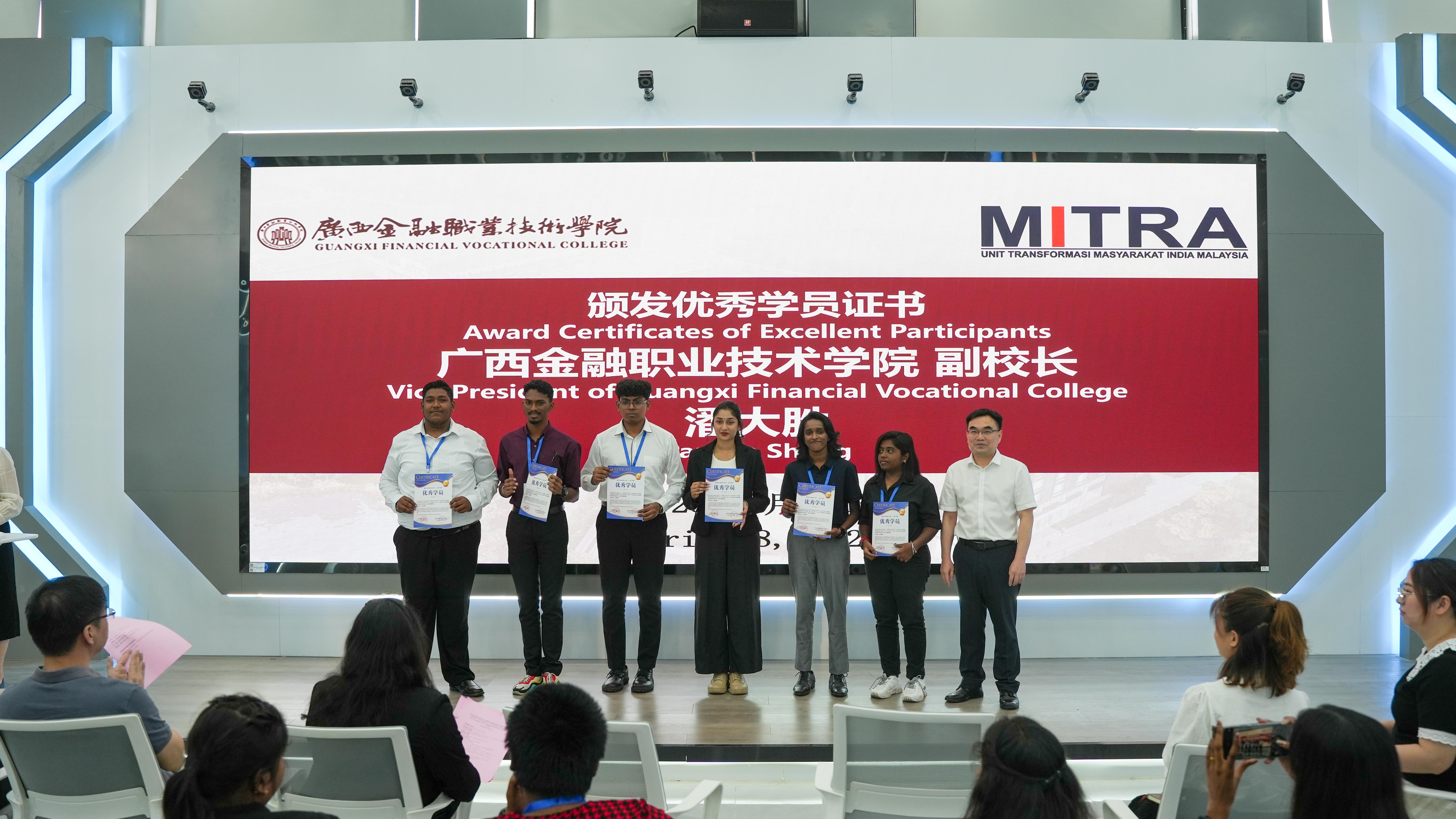 28日下午,本次交流学习的结业仪式在虚拟仿真实训基地隆重举行。万象城官网副校长潘大胜为印度社区转型单位学生颁发结业证书和优秀学员证书并致结业词。结业仪式由万象城官网对外交流处处长韦施羽主持。