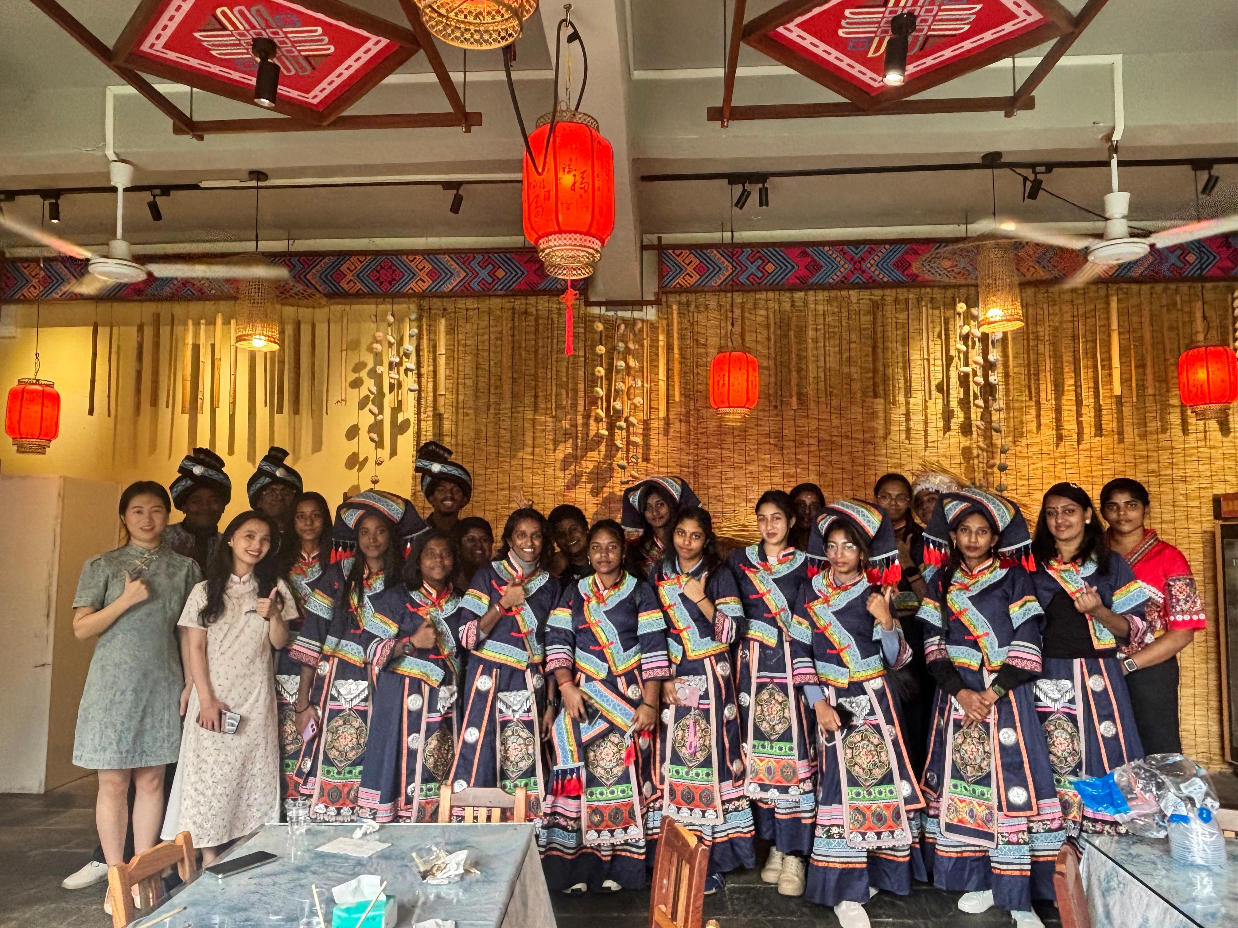 26日上午,印度社区转型单位师生身穿壮族服饰,在相思小镇参与毛南非遗馆的扎染、漆扇、包饺子等中国传统文化体验活动,沉浸式感受广西传统民俗文化的独特魅力。26日下午,前往广西规划馆深入了解广西政治、经济、文化、生态等发展情况及突出成就。