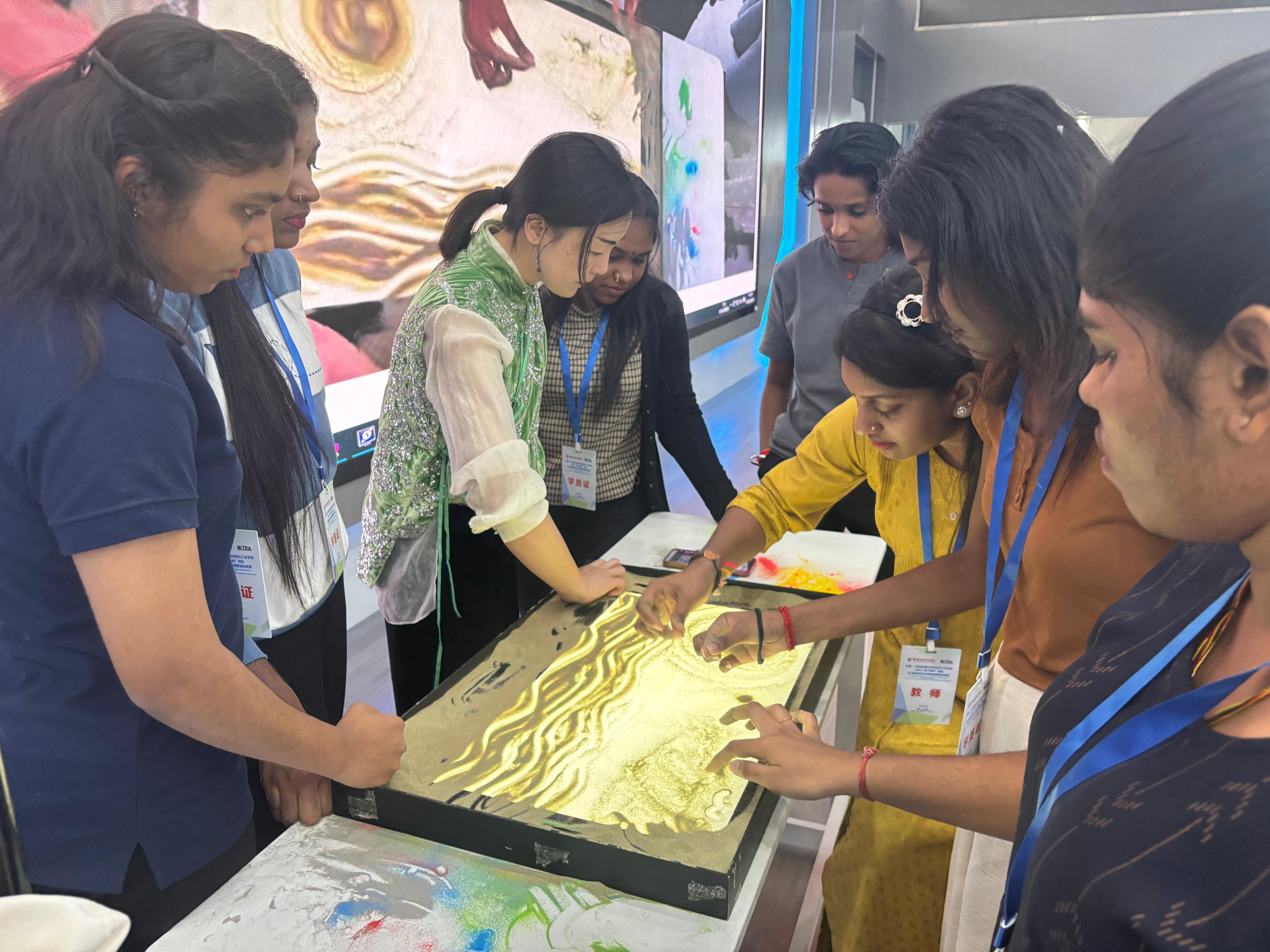 25日上午,印度社区转型单位师生参与《沙画艺术讲座与体验》课程。非遗传承人通过沙画演示讲解艺术脉络,融入壮锦、漓江、铜鼓等广西元素,展现八桂文化。学生执沙创作,通过沉浸体验理解中国文化与广西历史。