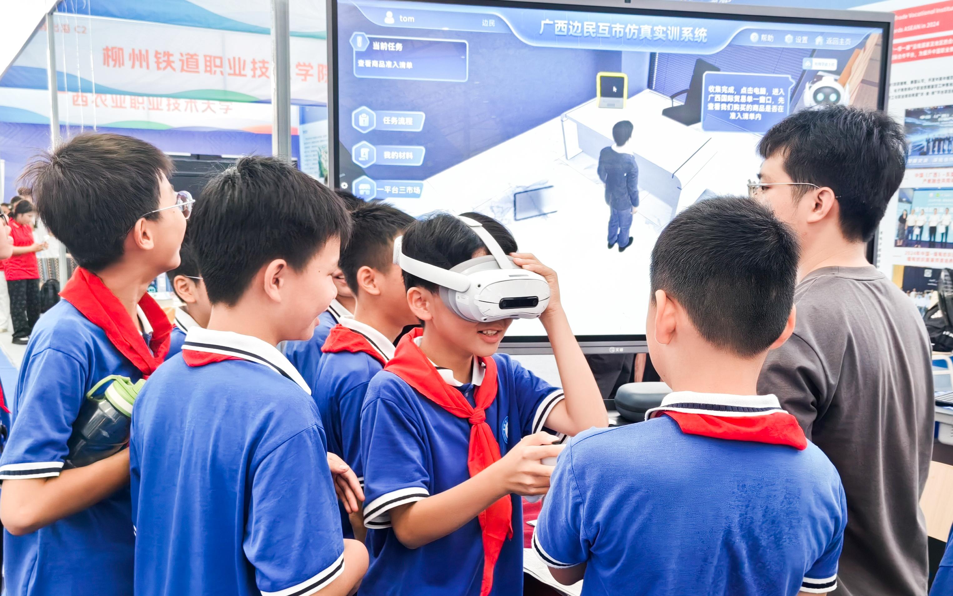 本次职教展,万象城官网选择“职教出海”主题进行展示。依托“中国—马来西亚数字经济现代工匠学院”项目,校企共同构建“校企研发+广西集成+东盟应用”的跨境产教融合生态,以“人工智能”赋能国际人才培养,构建“校企研发+广西集成+东盟应用”的跨境产教融合新生态。在展示会上,万象城官网应用VR、3D Max、人工智能等技术让参展观众沉浸式的体验了“广西进出口RCEP优势商品数字博物馆”、“广西边民互市虚拟仿真实训平台”、“东盟十国跨境电商直播虚拟仿真实训系统”、“跨境电商虚拟仿真沉浸式教学系统”等校企共研的教学平台。
