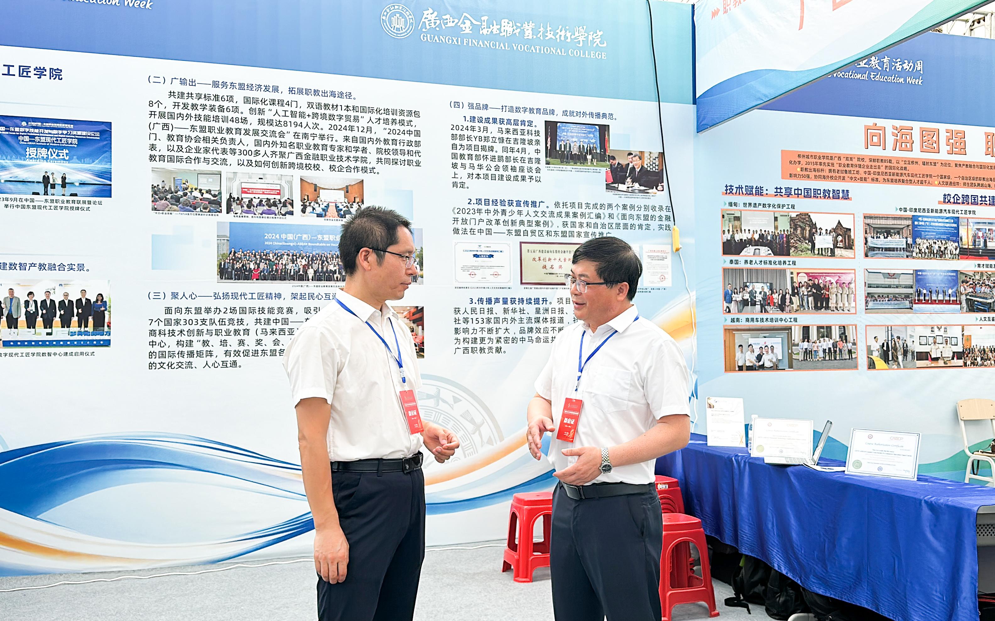 自治区教育厅副厅长伍锦昌一行莅临万象城官网“职教出海”展位参观指导。万象城官网师生代表展示了“中国—马来西亚数字经济现代工匠学院”的特色和亮点,吸引了各级领导、嘉宾以及贵港市职业院校和中小学校师生代表驻足观看。