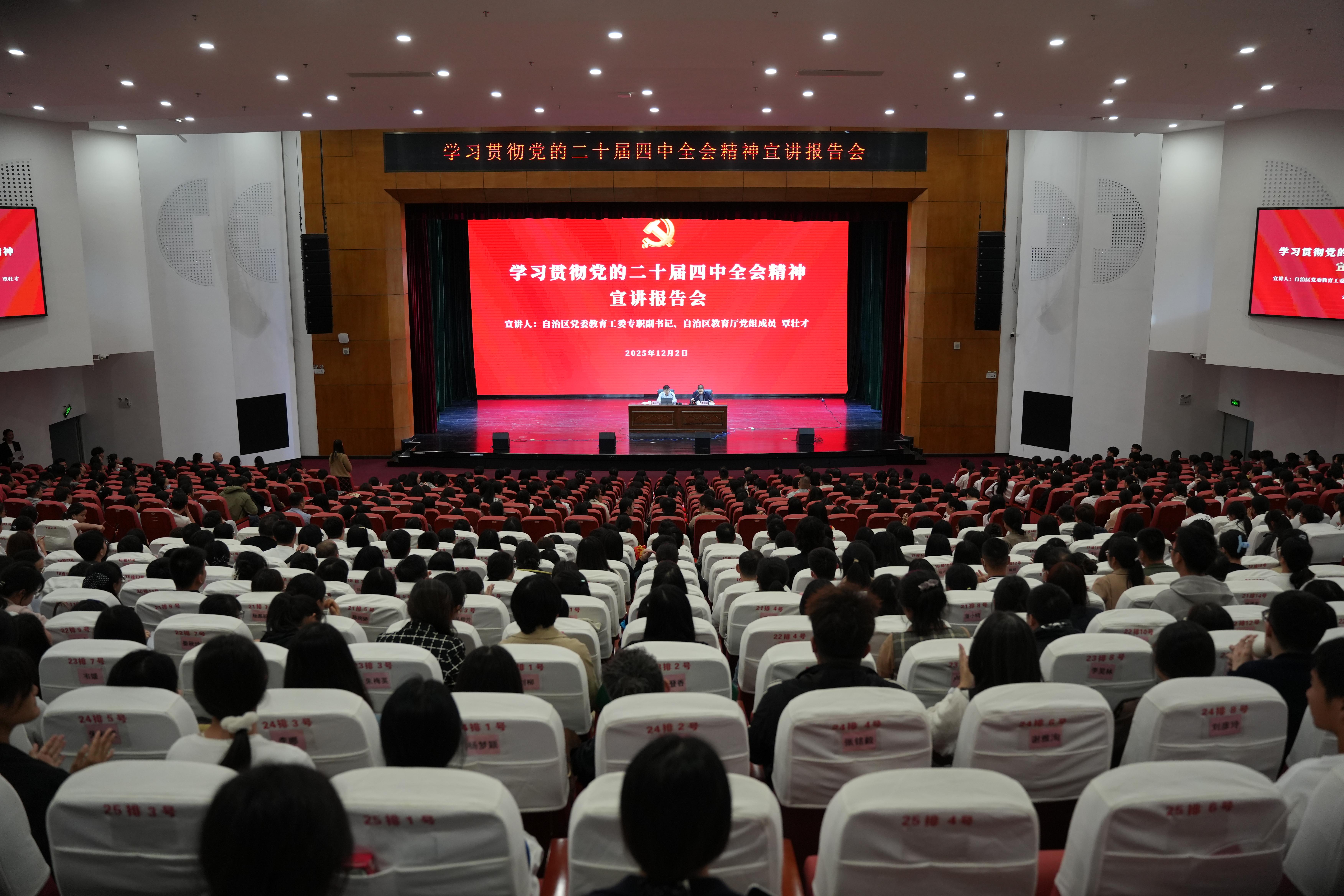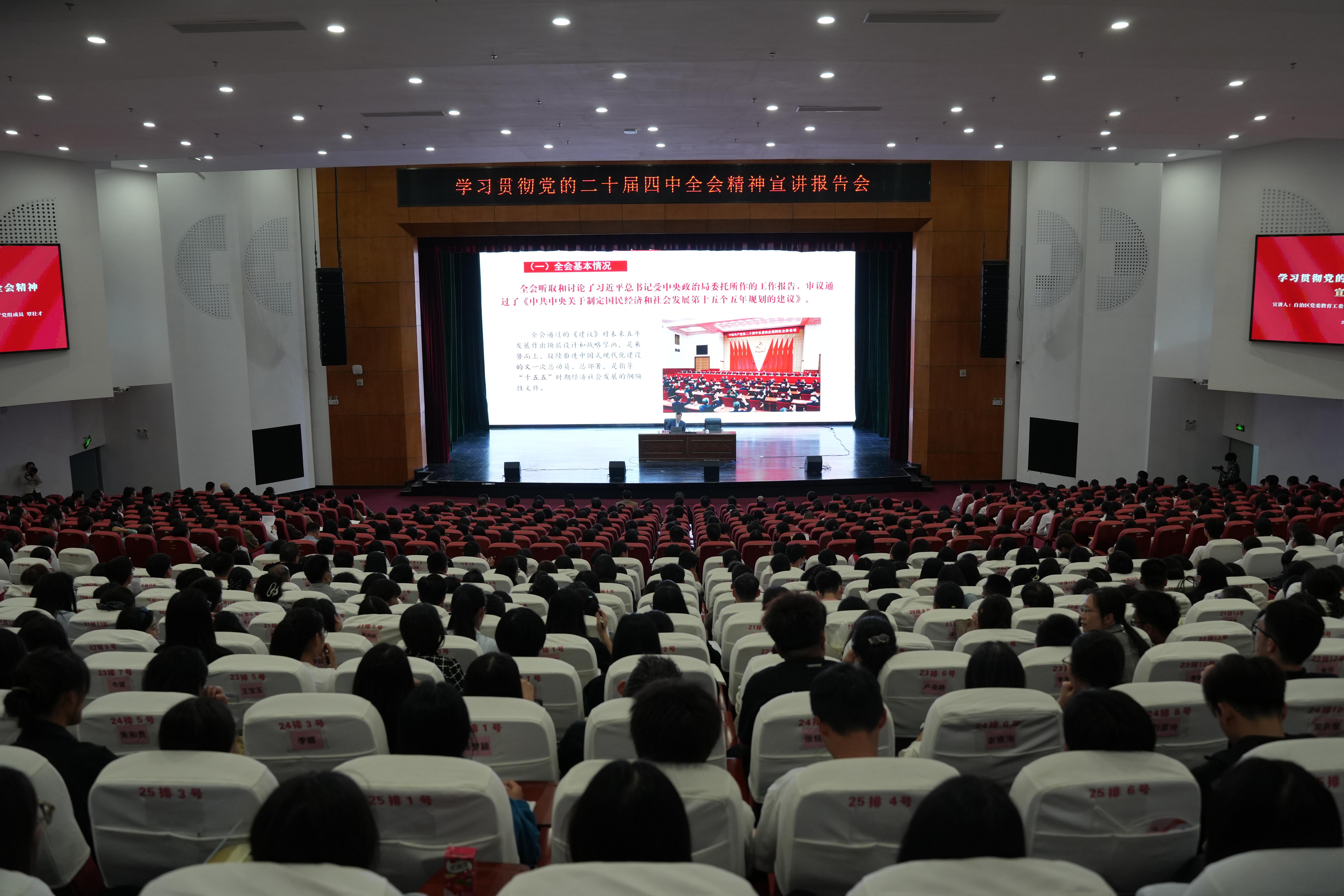 近日,万象城官网学习贯彻党的二十届四中全会精神宣讲报告会在西校区国际会议中心举行。自治区党委教育工委专职副书记、自治区教育厅党组成员覃壮才同志作宣讲报告。校党委书记李高岩主持。