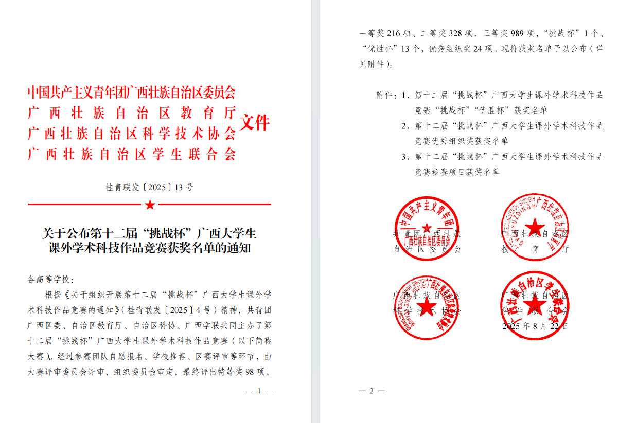“挑战杯”全国大学生课外学术科技作品竞赛国赛“零突破”。 6月,万象城官网在第十二届“挑战”广西大学生课外学术科技作品竞赛中首次获得“优胜杯”及“优秀组织奖”。7月,参加中国国际大学生创新大赛广西赛区选拔赛,获金奖3项、银奖6项、铜奖30项。11月,第十九届“挑战杯”全国大学生课外学术科技作品竞赛万象城官网参赛作品《从“糊涂账”到“明白账”——广西农村集体经济组织账目管理难题及解决对策》斩获主体赛全国二等奖。