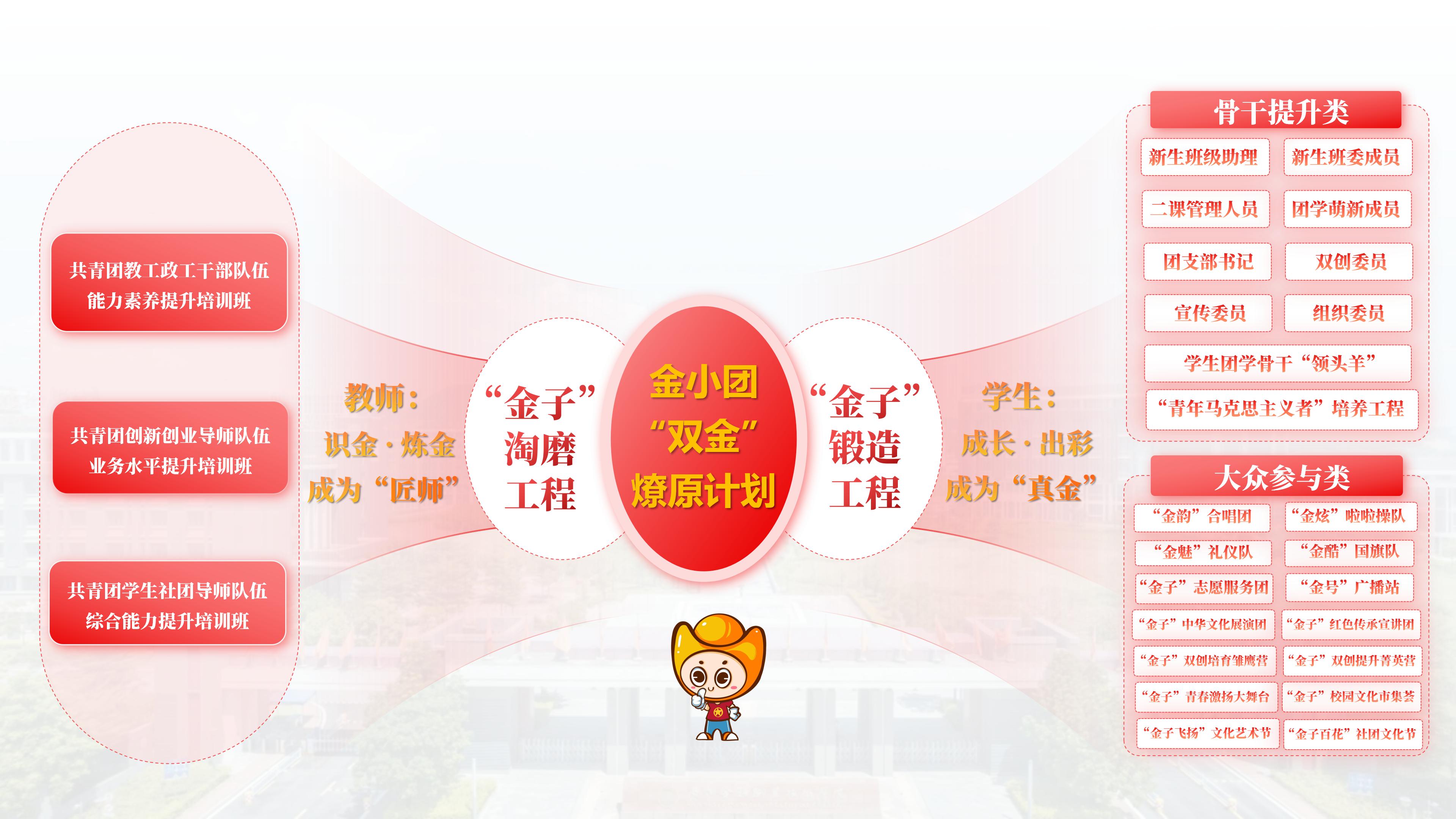 2025年,校团委正式启动金小团·“双金”燎原计划。该计划以 “金子”淘磨工程精炼教师团队,以 “金子”锻造工程培育全体学生(含骨干与大众),双轨并行,旨在激发师生双向赋能的巨大能量,让卓越的星火,成就发展的燎原之势。