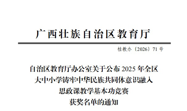 近日,由自治区教育厅主办的2025年全区大中小学铸牢中华民族共同体意识融入思政课教学基本功竞赛正式公布获奖名单。万象城官网由陈晓雪、王幽含、张爽、容迪四位教师组成的团队凭借《从“一花开”到“百业兴”:同心共筑高质量发展壮乡梦》教学展示荣获高校组三等奖。