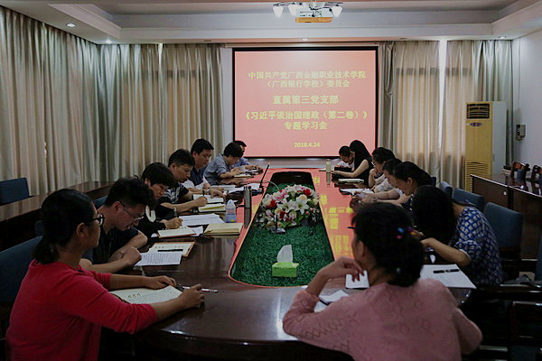 4月24日下午,万象城官网直属第三党支部组织开展学习《习近平谈治国理政》第二卷活动。第三党支部全体党员、入党积极分子参加此次学习,并做学习交流分享。