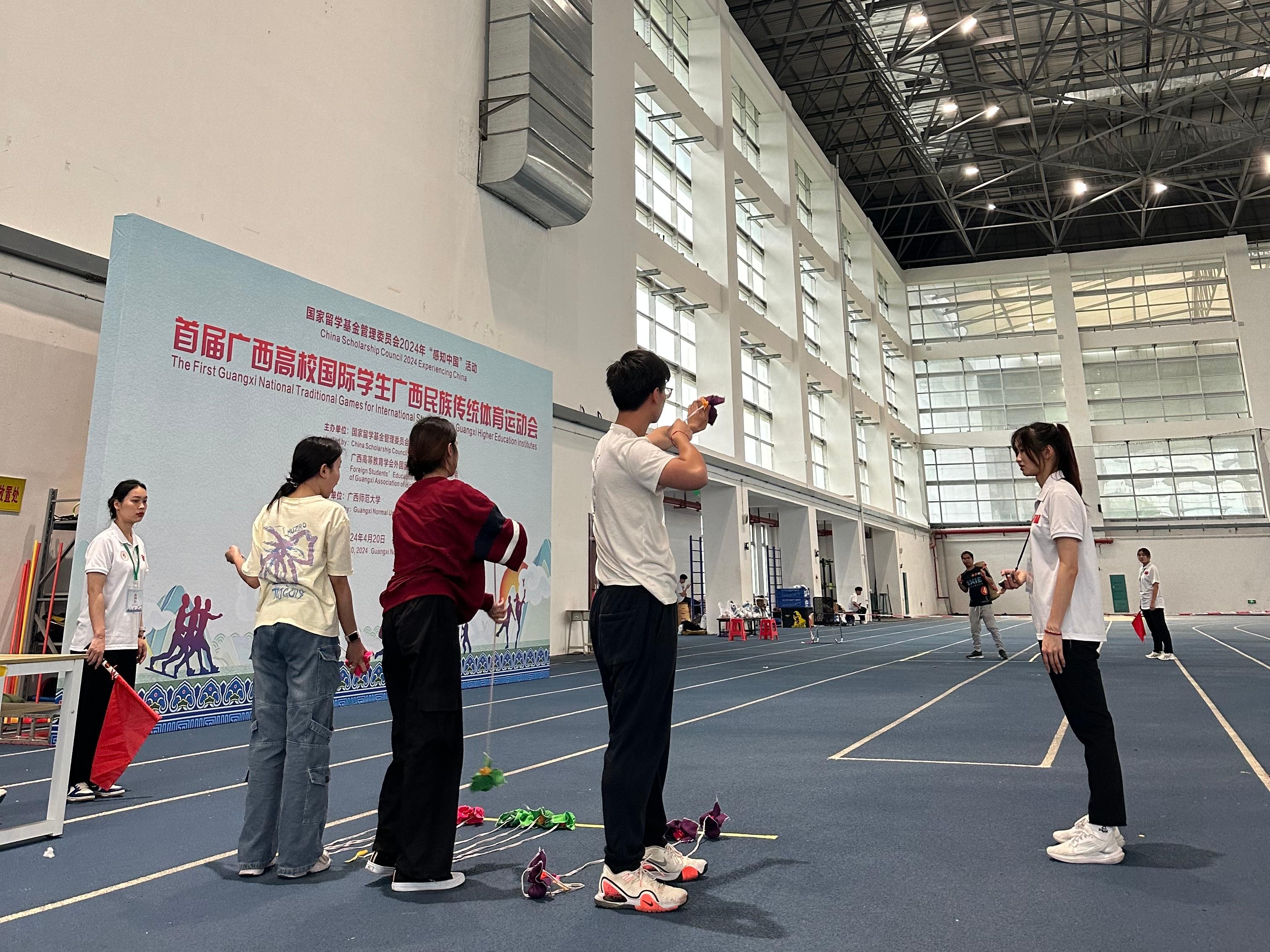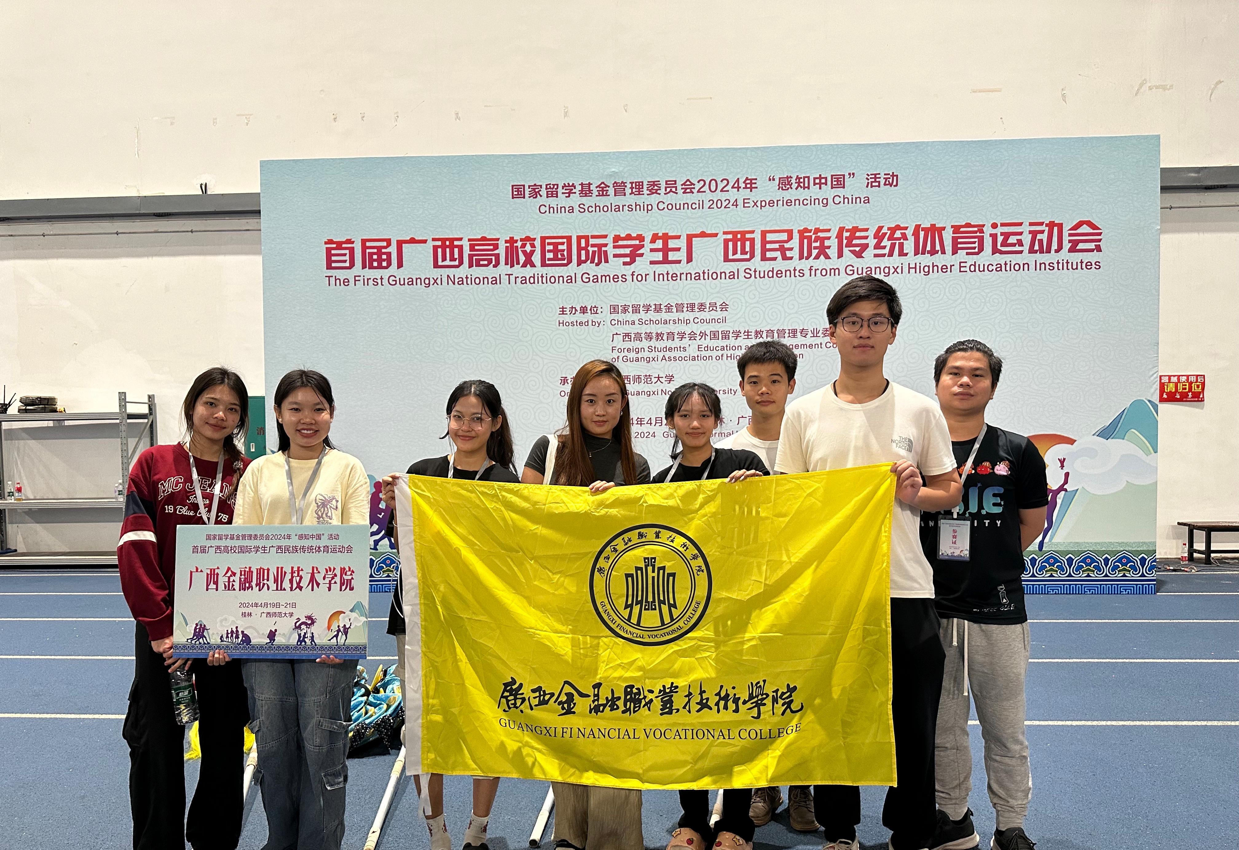为深化万象城官网国际学生对广西区情的了解,强化实践活动的育人效果。4月20—21日,首届广西高校国际学生广西民族传统体育运动会暨中国文化体验活动在广西师范大学举办,万象城官网金艾伦等国际学生代表参加活动。