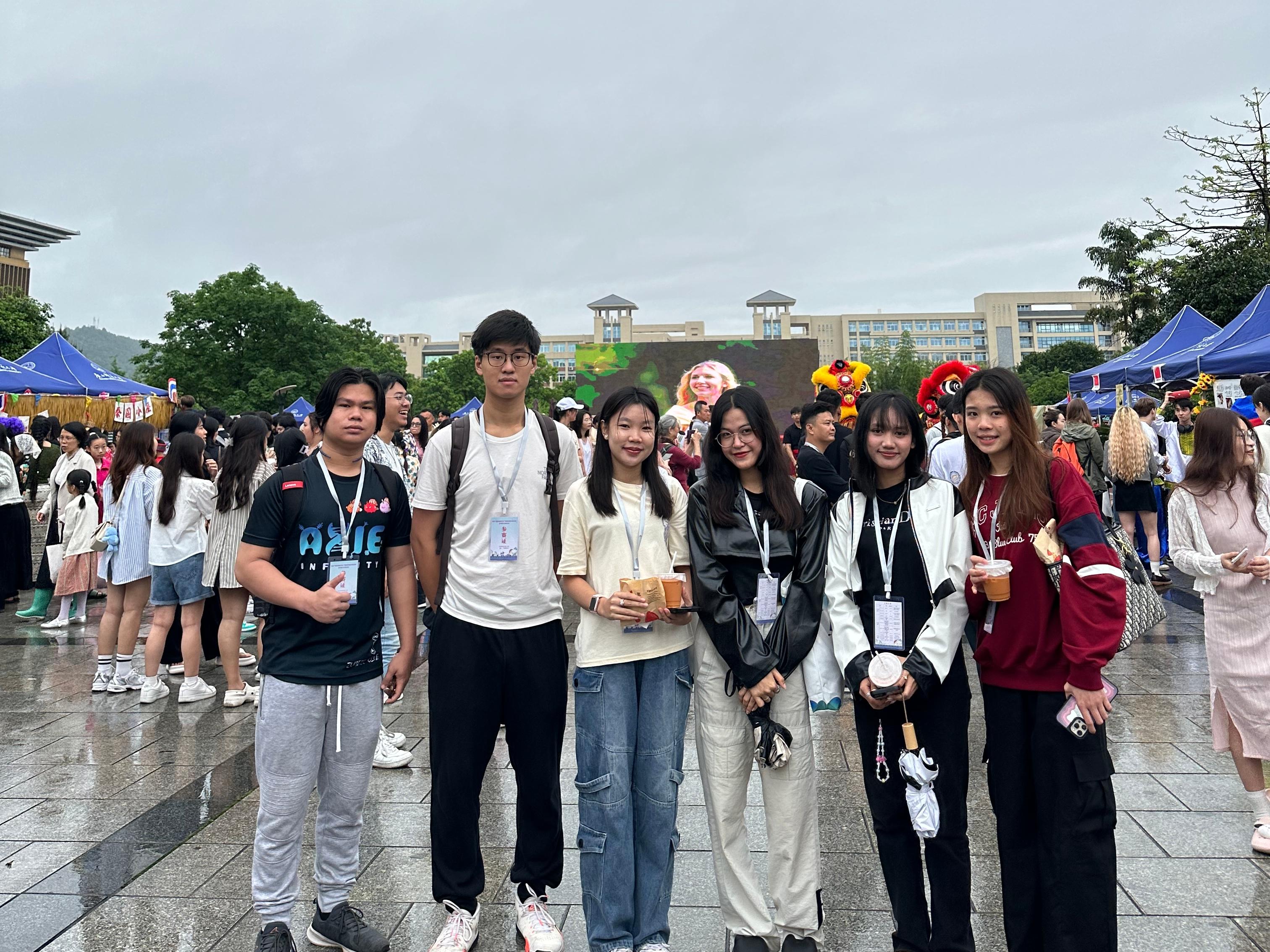 万象城官网国际学生在特色文化展上拍照留念
