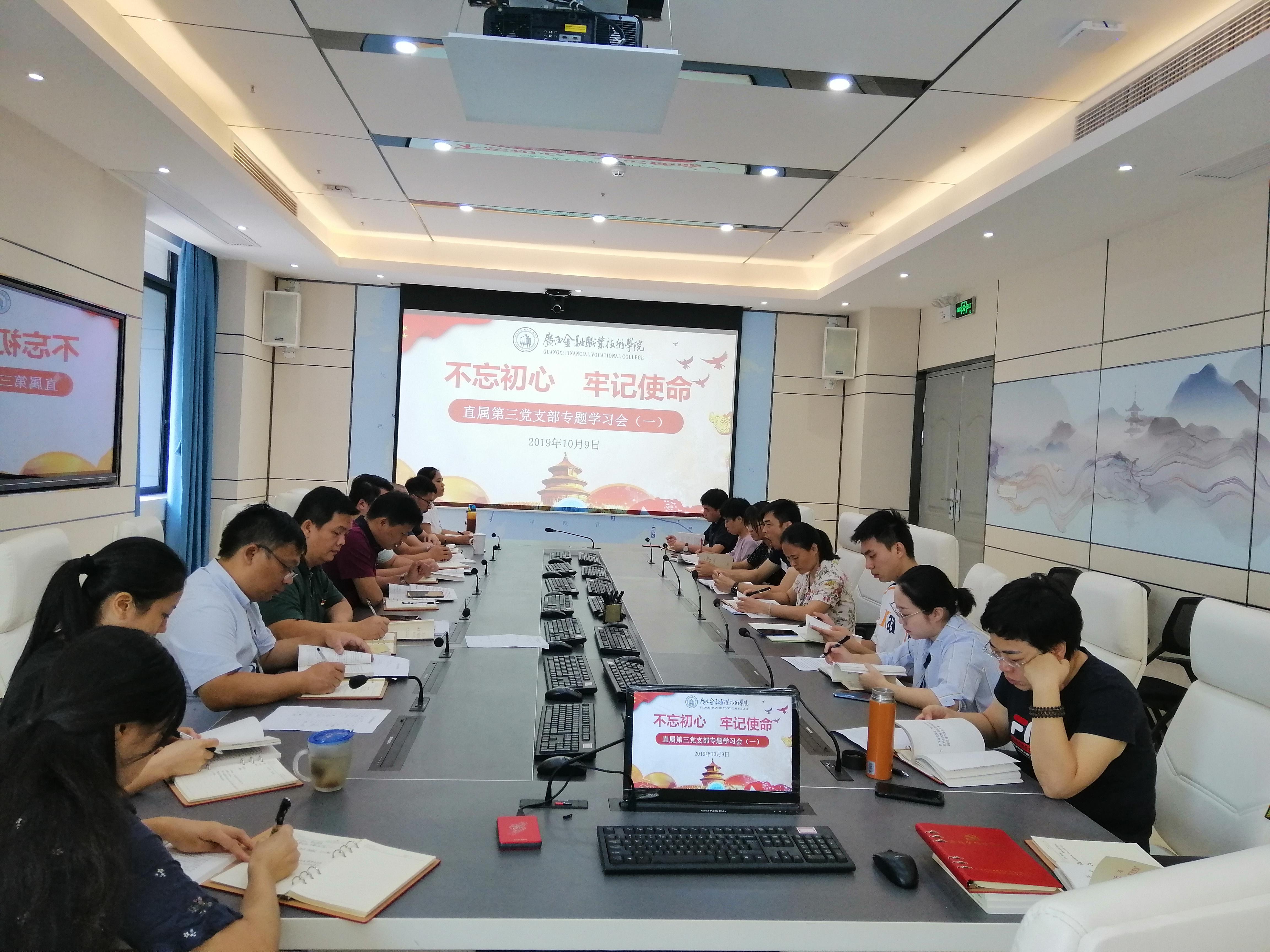 10月9日上午,直属第三党支部在西校区行政办公楼103会议室开展“不忘初心、牢记使命”主题教育第一专题研讨学习会。本次学习会参加对象为支部党员与预备党员,学院党委副书记刘华政以普通党员身份参加并作研讨发言,研讨学习会由直属第三党支部书记周海峰同志主持。