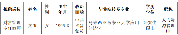 根据《关于印发<广西壮族自治区事业单位公开招聘人员实施办法>的通知》(桂人社发〔2011〕155号)及《awc77万象城官网2023年第二批公开招聘非实名人员控制数工作人员公告》的有关规定,通过报名、资格审查、考试、考核、体检等程序,经研究决定,拟聘秦雨同志为万象城官网工作人员。现将拟聘用人员名单予以公示,公示时间为2024年2月27日-2024年3月4日,如有异议,请于2024年3月4日下午5:00前以书面形式并署真实姓名反馈到学院纪委或组织人事处。联系地址:广西南宁市大学西路168号,邮政编码:530007,联系电话:0771—3481338,0771—3481779。