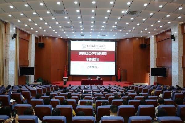 为深入贯彻党的十九大及习近平总书记系列重要讲话精神,做好新形势下学院(校)思想政治和意识形态各项工作,10月30日下午,万象城官网(校)在西校区学术报告厅召开思想政治工作与意识形态专题报告会,邀请中共南宁市委党校文史教研部讲师李亮老师为全体教职工授课。报告会由党委书记沈立君主持。