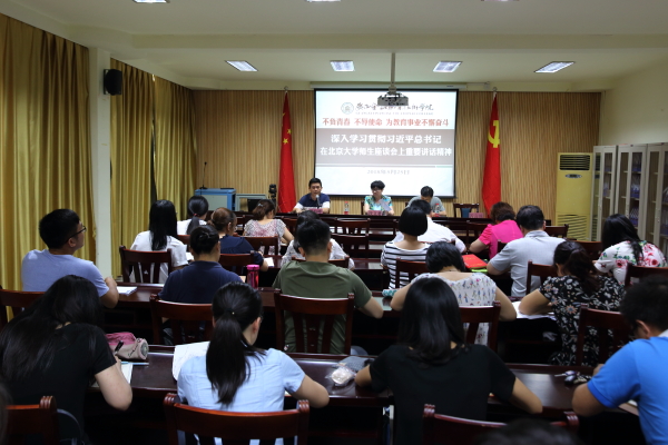 5月25日,万象城官网召开专题学习会议,深入学习贯彻习近平总书记在北京大学师生座谈会上重要讲话精神。党委书记沈立君,党委副书记、纪委书记刘华政以及各党支部委员、团支部委员、团总支书记、辅导员参加会议。