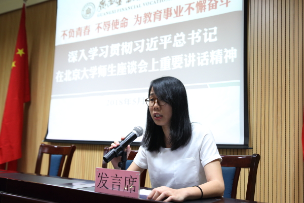 校团委代表潘瑞兰老师、系部团总支代表任蕊、岑玉明老师以及辅导员代表赖玉珊老师分别结合本职工作,谈了自己的学习心得体会。表示要做一个有理想信念、有道德情操、有扎实学识、有仁爱之心的“四有”教师。在今后的工作中要把立德树人内化到学生管理各领域、各方面,同时带领广大学生继续自觉、坚定的深入学习习近平总书记重要讲话精神,把习近平总书记提出的要求和希望贯彻到日常的工作和学习中。