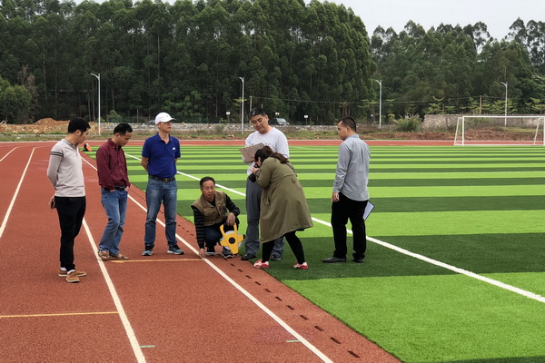 验收过程中各方人员对新校区田径场地布局、使用功能、主跑道及田赛项目助跑道的平整度、厚度、跑道宽、分道宽、内突沿高度、分道和直道数量、田赛场地规格、预埋设施尺寸、跑道的点位线参数等方面进行了详细查验。