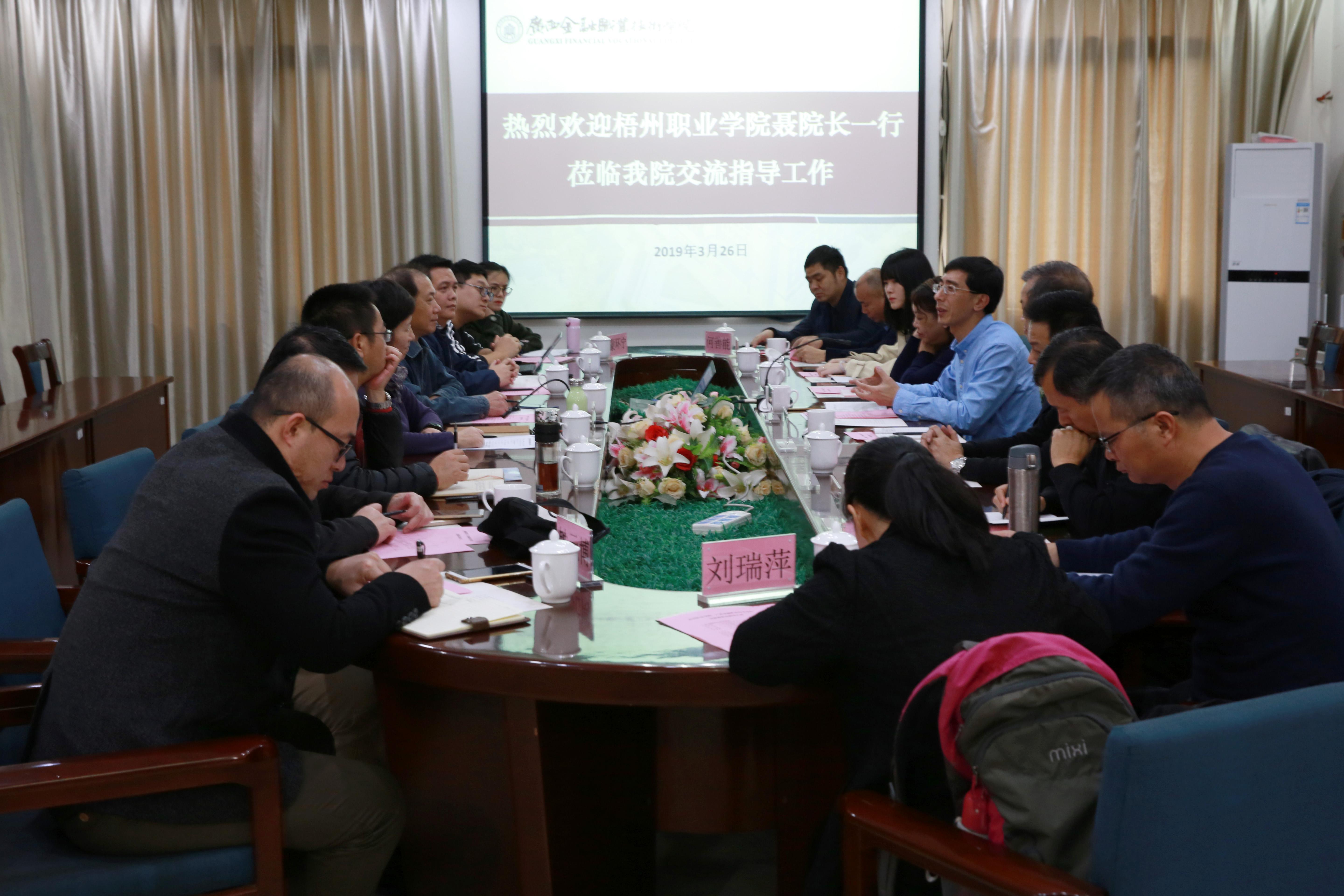 3月26日下午,梧州职业学院院长聂振传、学院顾问覃洪斌等一行10人来访万象城官网。万象城官网院长莫海燕、院长助理罗坚及各二层单位相关负责人热情接待了聂院长一行,双方在东校区5楼会议室召开了交流座谈会。