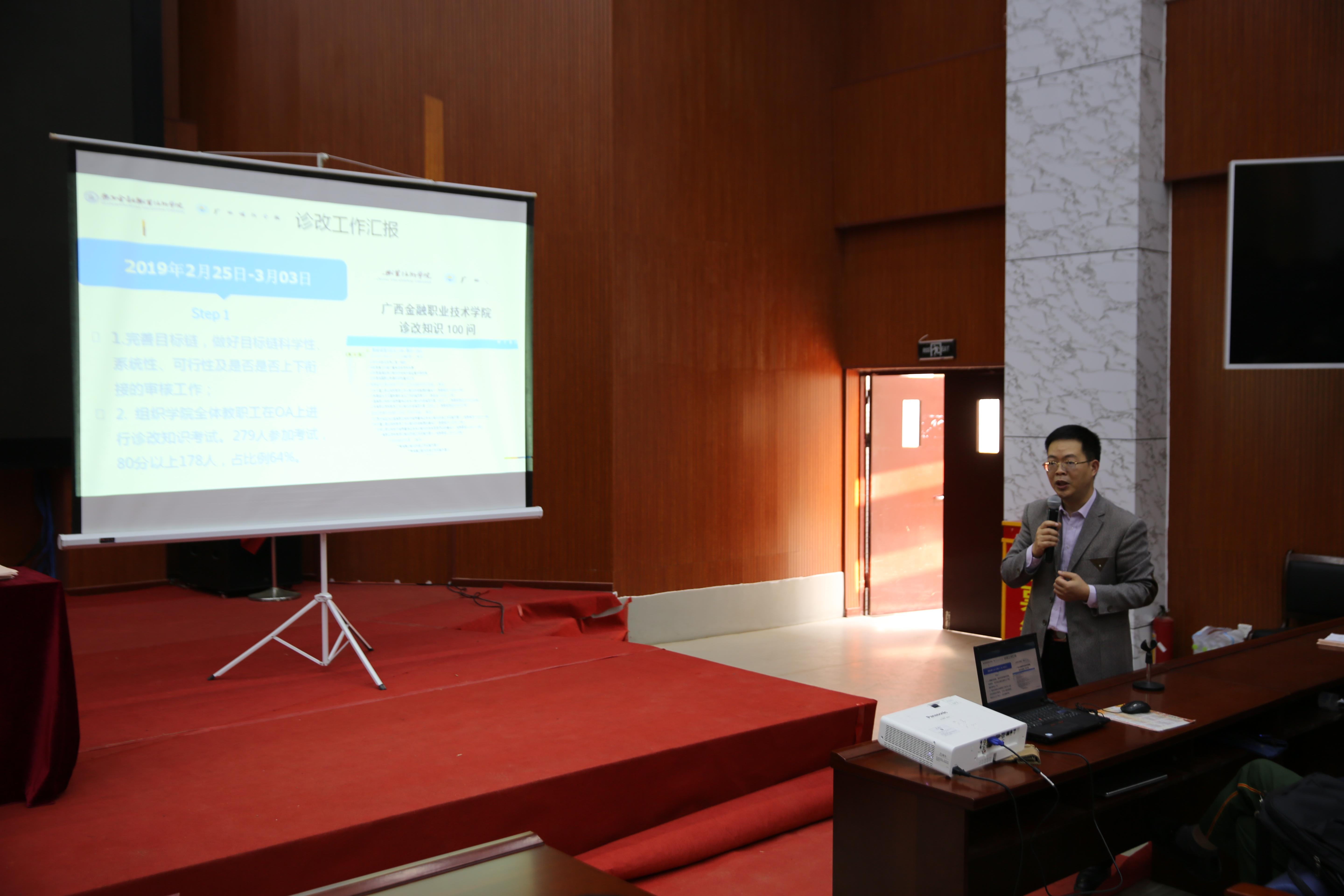 会上,学院质量办韦滨同志就3月份学院各部门迎接诊改复核工作的任务完成情况进行阶段性汇报,对诊改复核所需的汇报材料、支撑材料、备用材料和展示材料等文件的准备情况,各项任务的具体完成进度和存在的问题等情况作了详细说明。