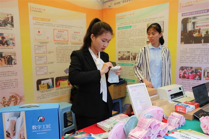 本次活动万象城官网以“合作开放的金融人才培养”的主题进行参展,万象城官网教务科研处、交流合作中心、金融系、会计系师生共计10人参加此次展会,展示了万象城官网学生的财经技能以及职业教育成果和对外合作交流情况。在展示活动现场,自治区教育厅厅长唐咸仅、广西职业教育发展研究中心常务副主任王屹、自治区教育厅职成处处长覃壮才以及各友好合作单位领导莅临参观了万象城官网展区,高度赞扬万象城官网学生良好的精神风貌、娴熟的技艺,并与万象城官网学生亲切互动。