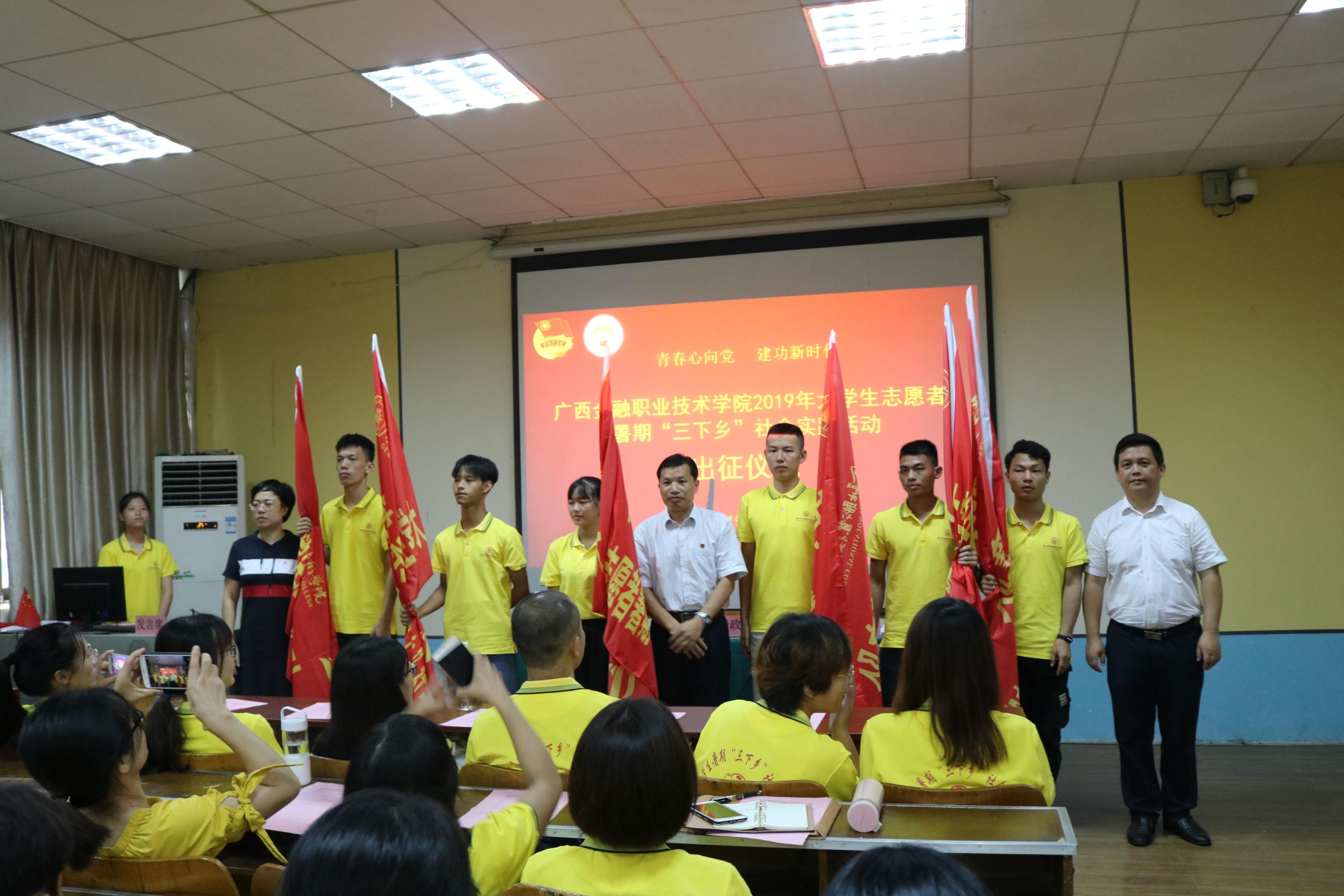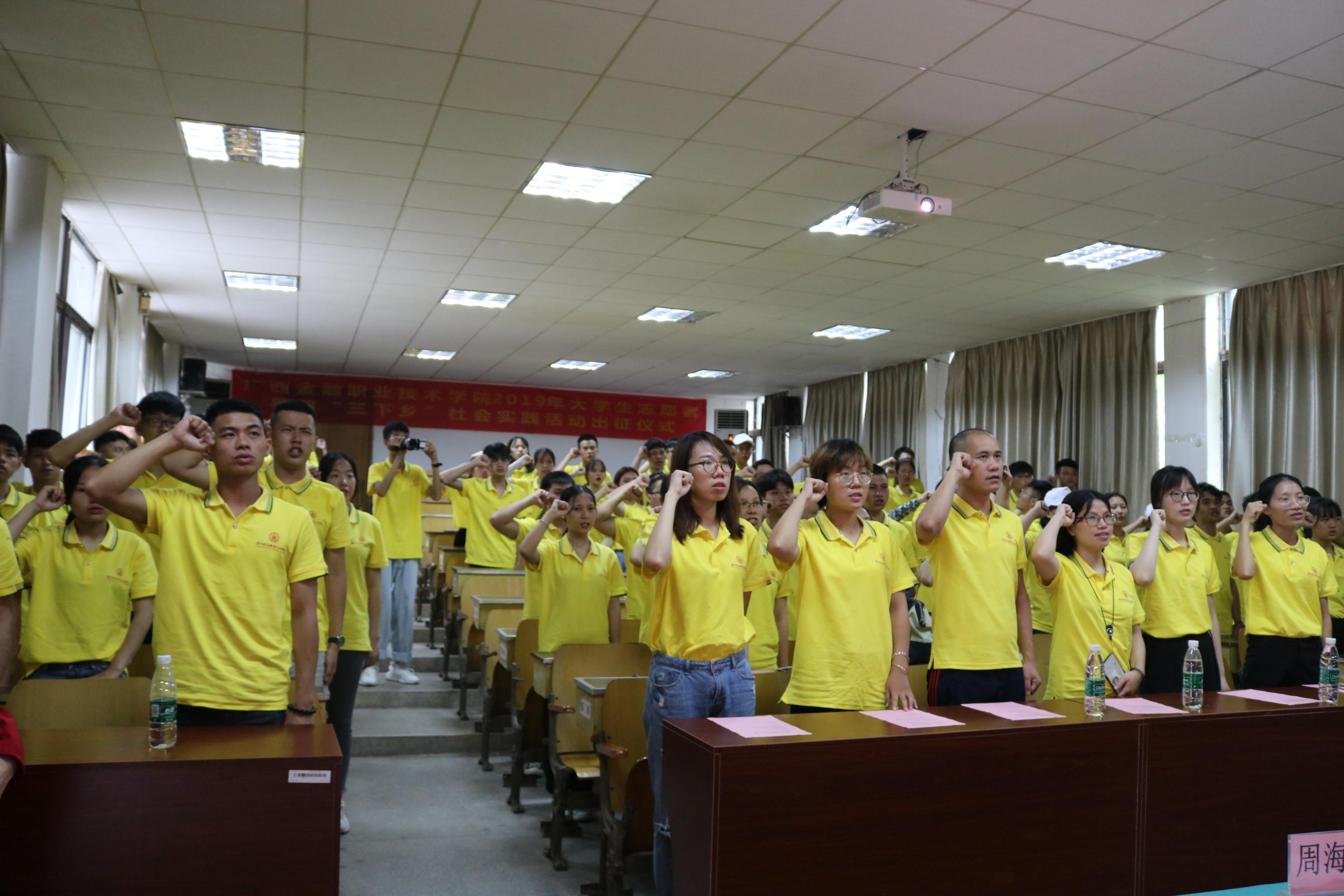 仪式上,投资与保险系实践服务团教师代表韦淑灵老师、会计系1812班学生志愿者代表覃圳同学分别发言,实践服务团全体队员进行出征宣誓。大家一致表示,一定增强团队合作的精神和吃苦耐劳的品质,发挥金职院学生的专业优势,努力为基层提供力所能及的志愿服务,展示金职院青年良好的精神风貌。