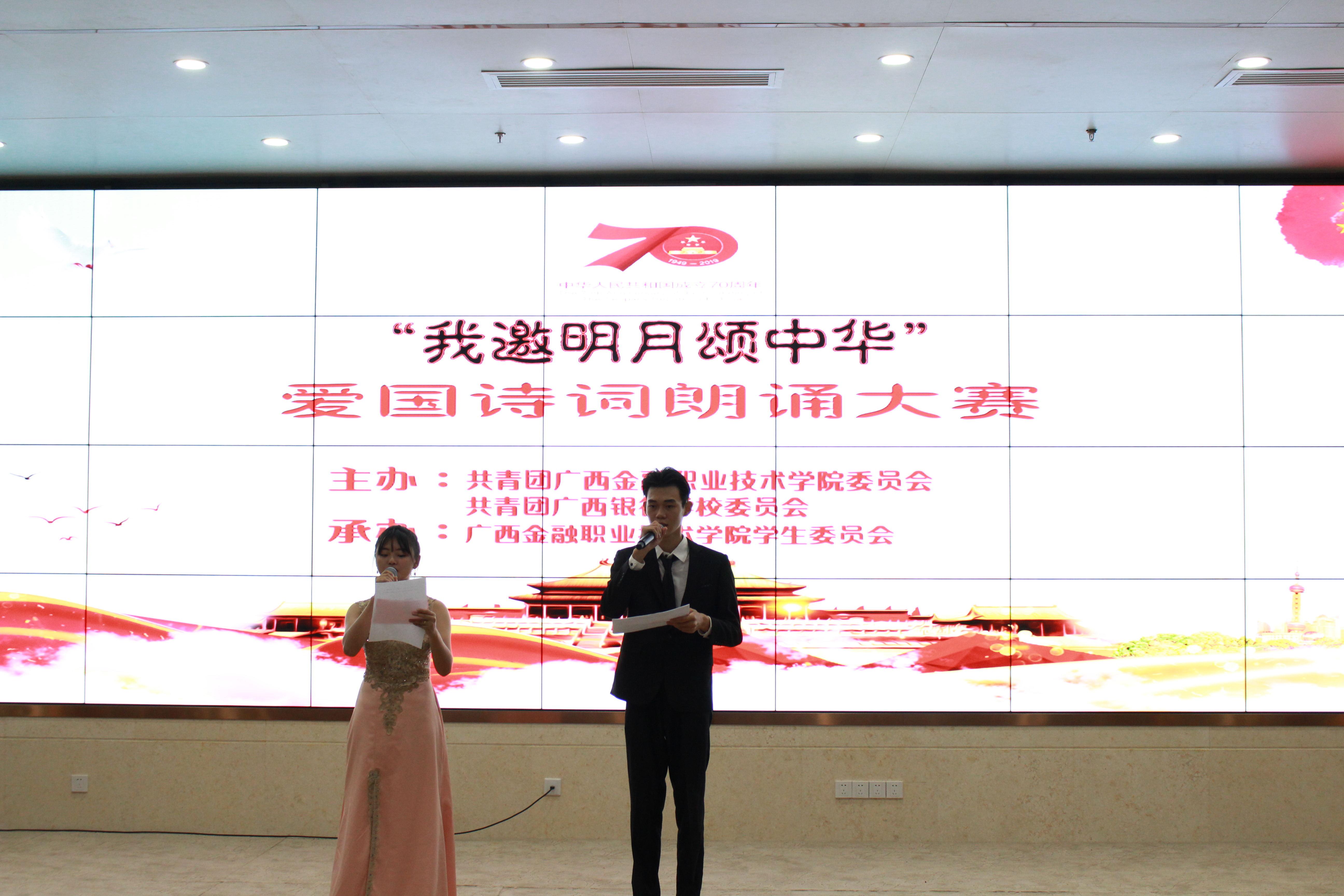 以诗邀明月,以情咏时代。为深入学习贯彻习近平新时代中国特色社会主义思想和党的十九大精神,庆祝中华人民共和国成立70周年,讴歌伟大中华人民共和国成立70年光辉历程,9月11日晚,共青团awc77万象城官网(广西银行学院)委员会在万象城官网西校区道德大讲堂举办“我邀明月颂中华”爱国诗词诵读比赛。来自6个系部的代表队伍参加了此次朗诵比赛。学生工作与招生就业处蒙莹莹老师、欧恬君老师、龙雪康老师、刘晗蕾老师及经济管理系陈丽霞老师担任评委。
