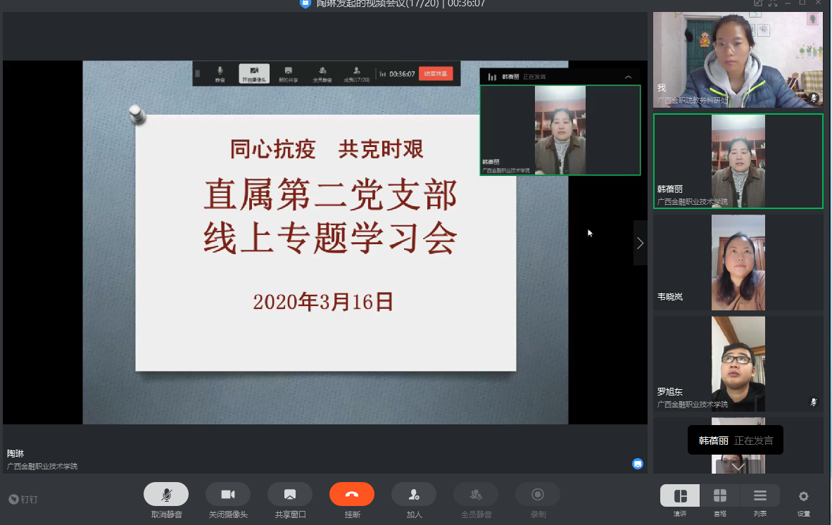 为进一步坚定抗“疫”信心,激励党员在战疫中更好地践行初心和使命, 3月16日晚,直属第二党支部组织全体党员开展线上专题学习会,并结合疫情防控思政大课课程内容分享了各自的学习心得,学院副院长潘大胜以普通党员身份参加会议,会议由党支部书记韩蓓丽主持。