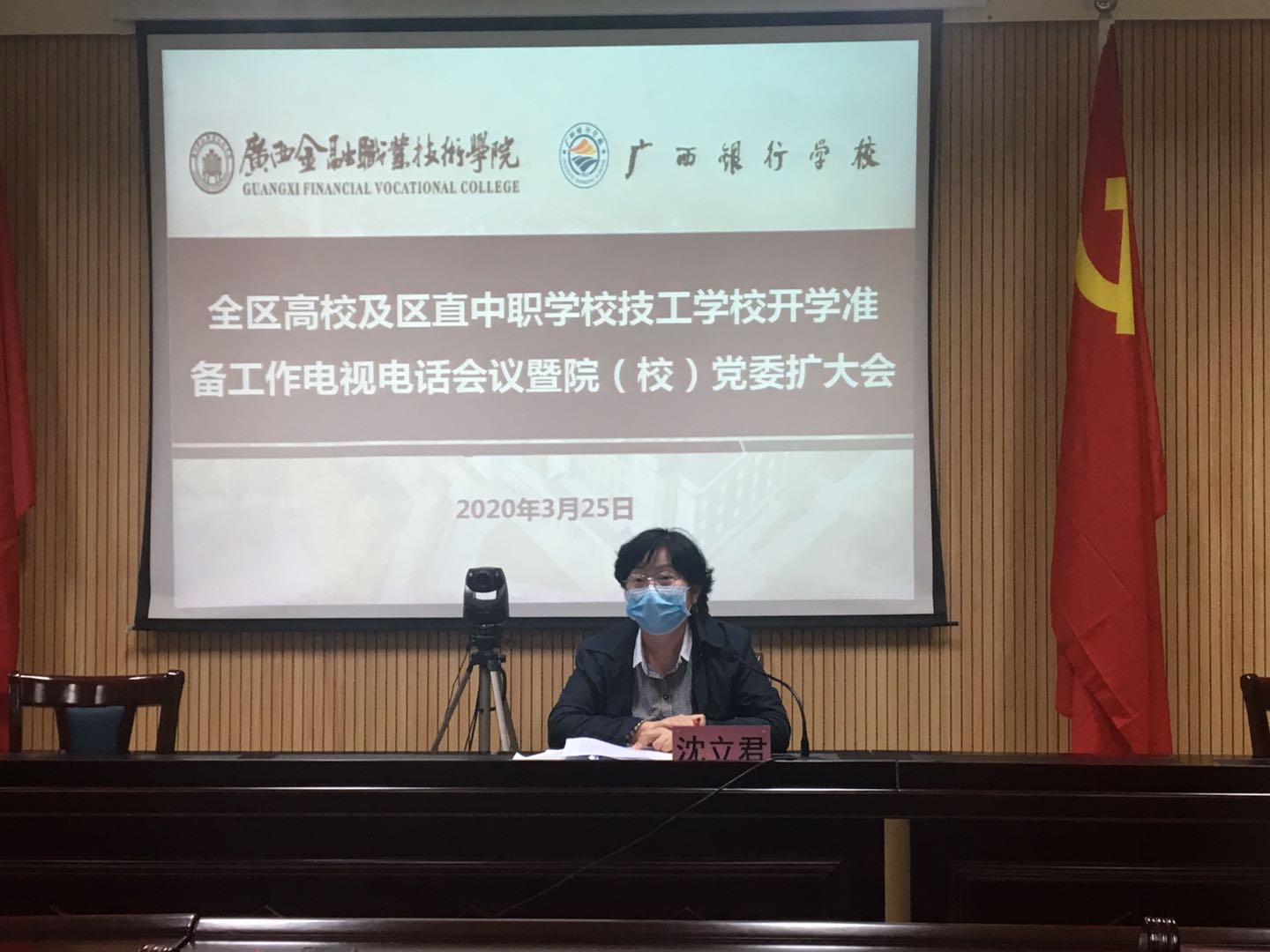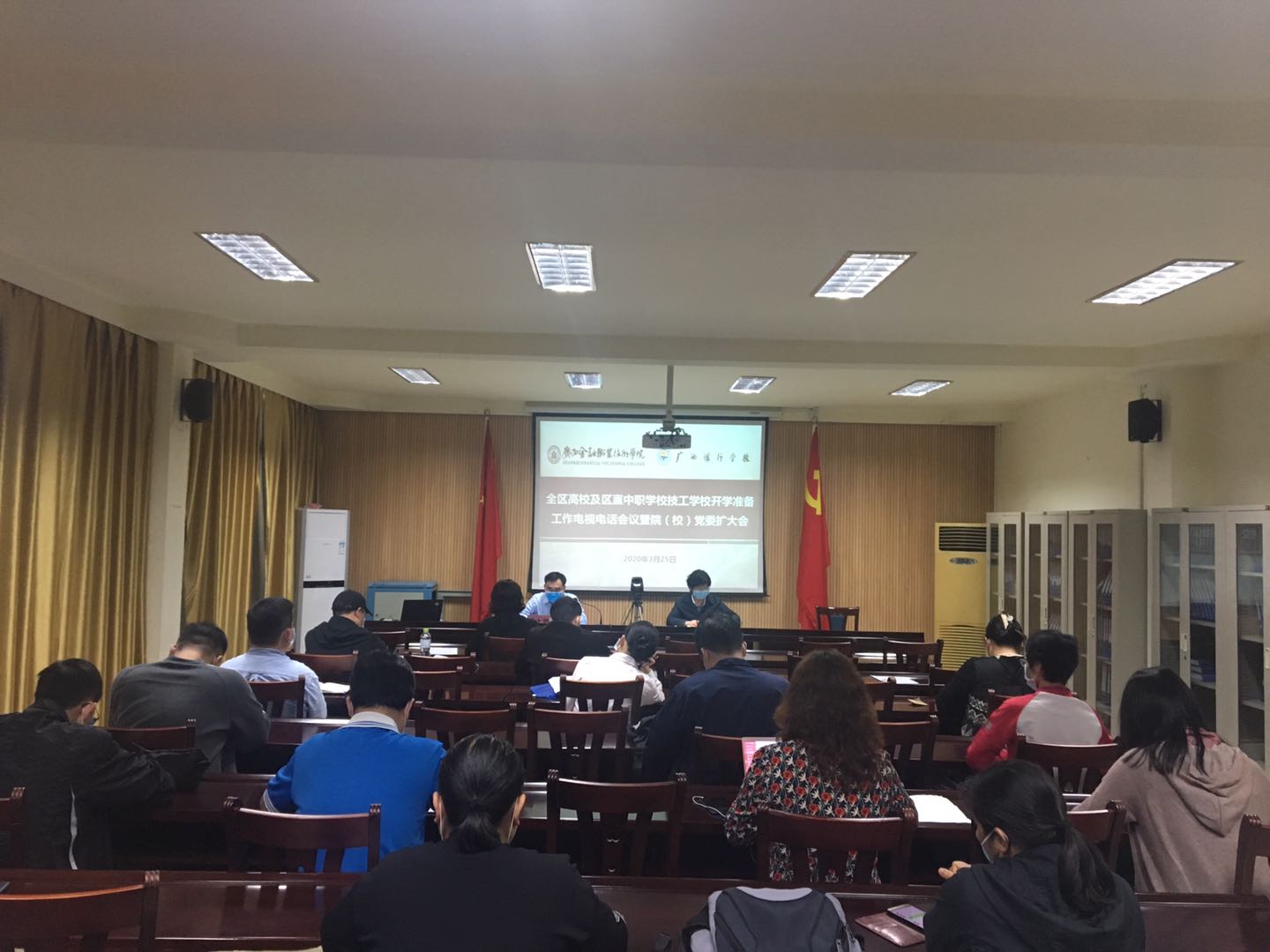 3月25日下午,在全区高校及区直中职学校技工学校开学准备工作电视电话会议结束后,为了及时贯彻落实会议精神,万象城官网在东校区办公楼6楼会议室召开党委扩大会议,校领导、各二层单位主要负责人参加会议。